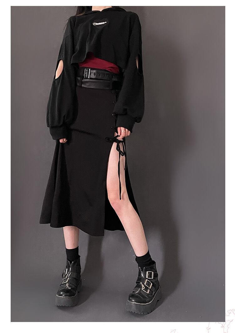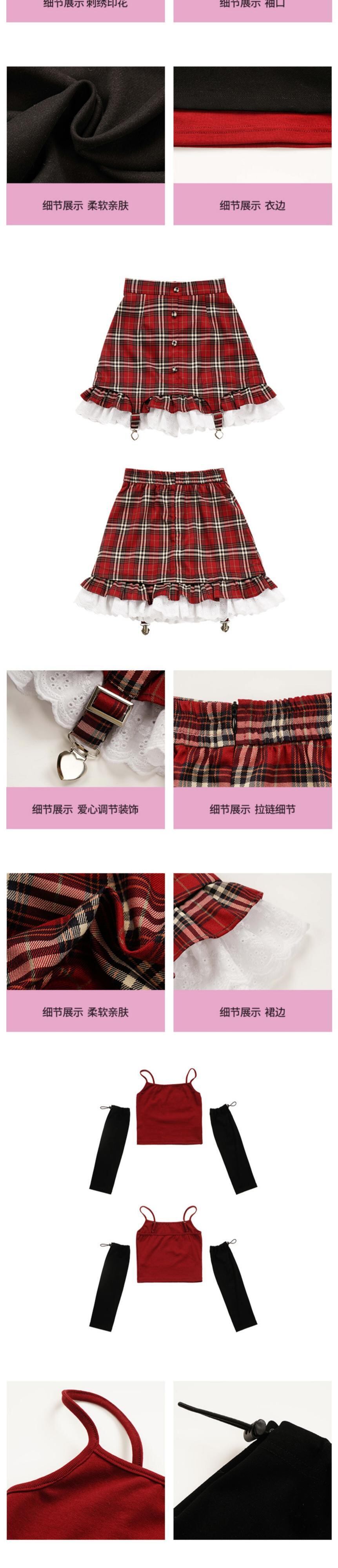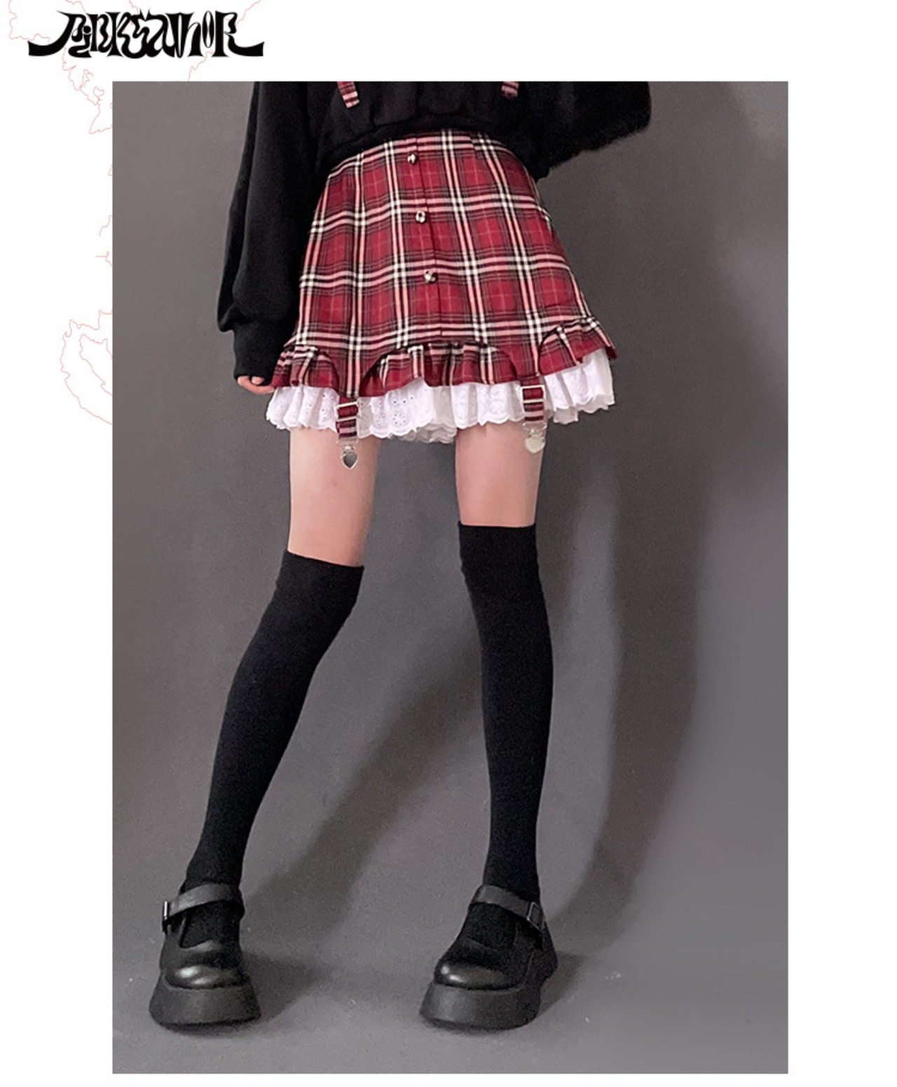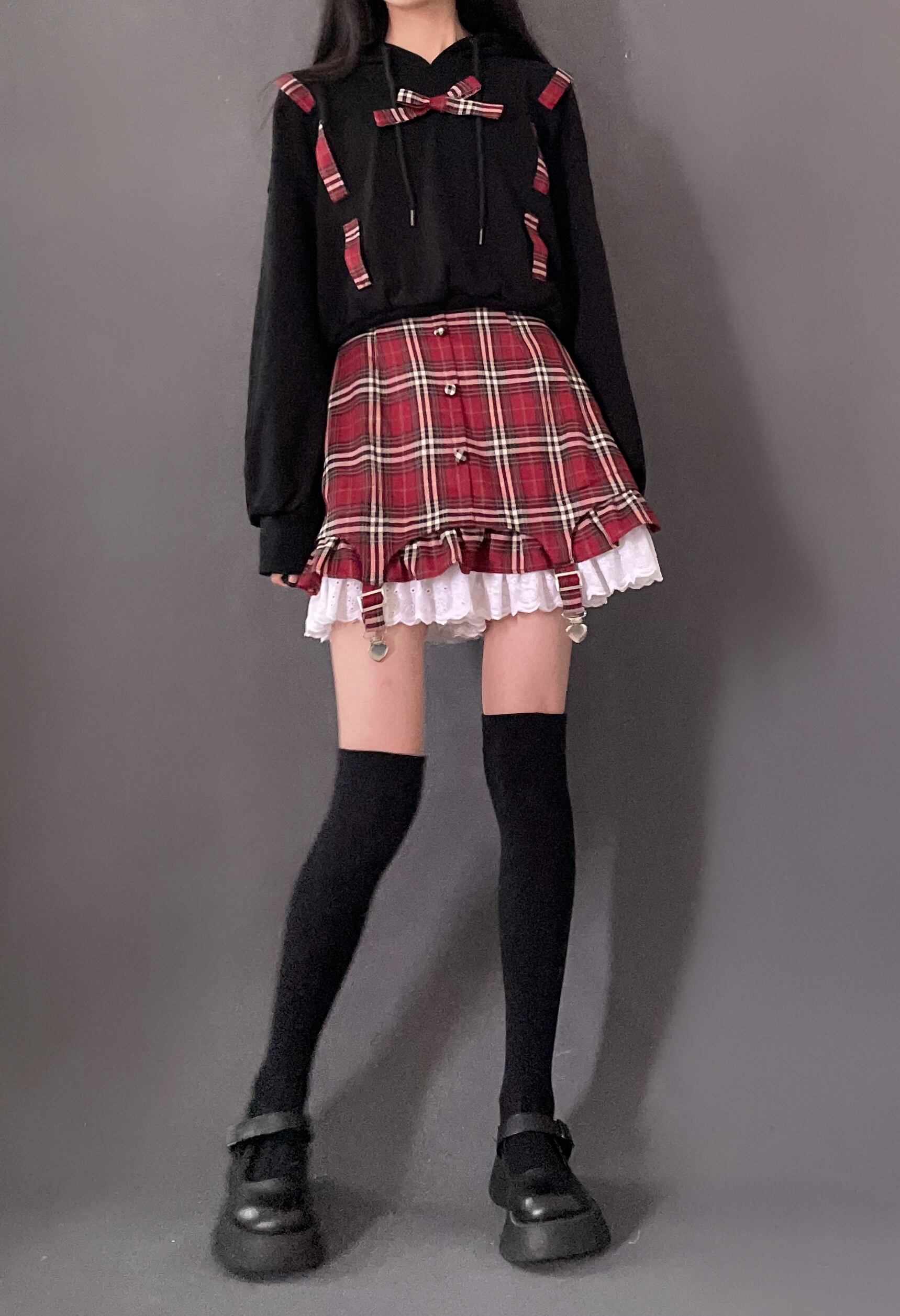 色:黒いセーター,レッドチェックスカート,ハートピンフード付きスウェットシャツ,黒のスリットスカート