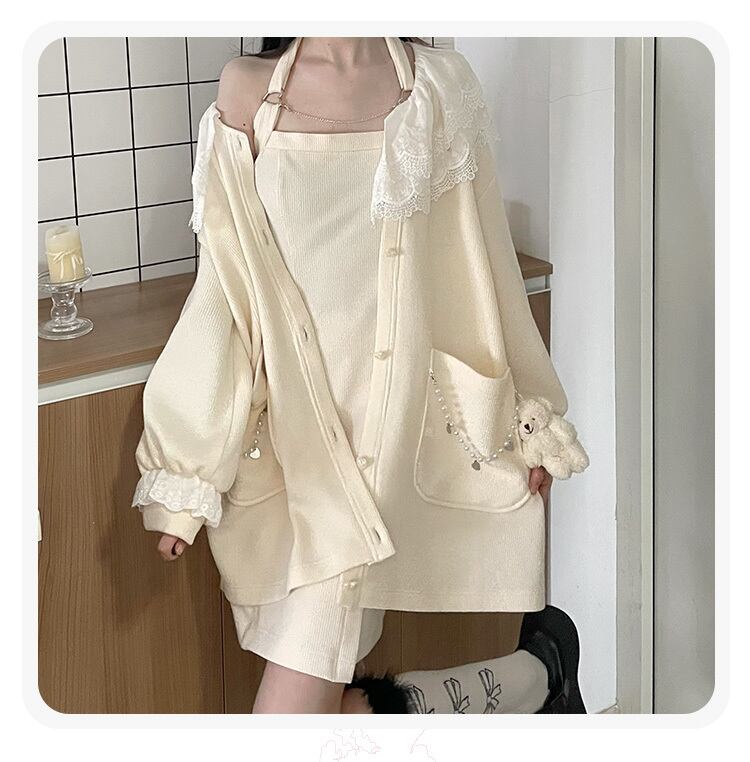 pinksavior [Gift of Bear]早春レースニットクリーム&ブラックホルタースリングセット ピンク スプリング 春物 PSTB49401167154