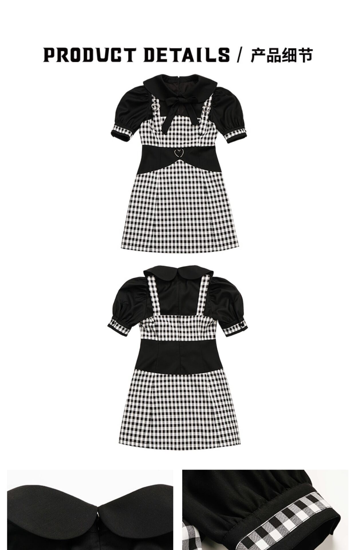 色:黒と白のチェックフェイクツーピースドレス,ダブルハートスクエアネックワンピース