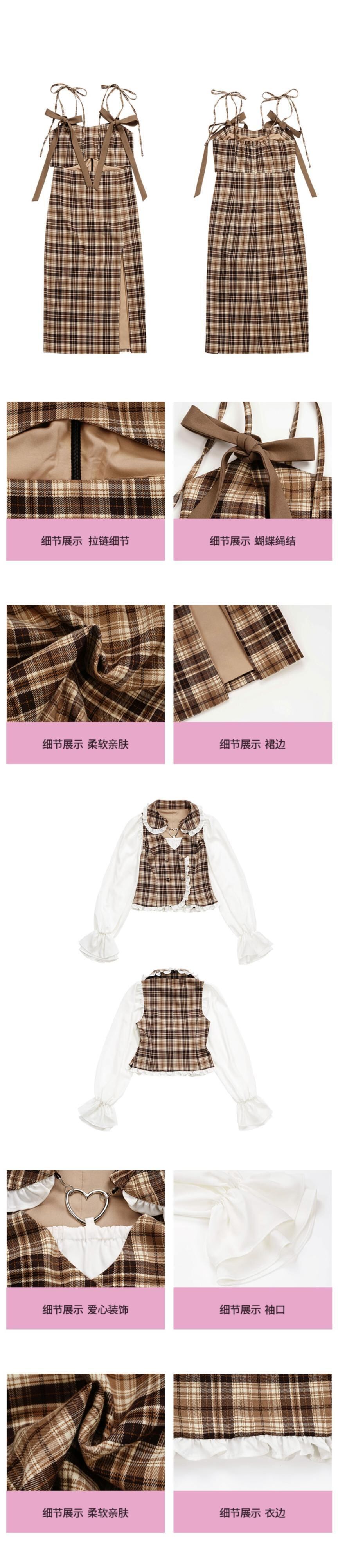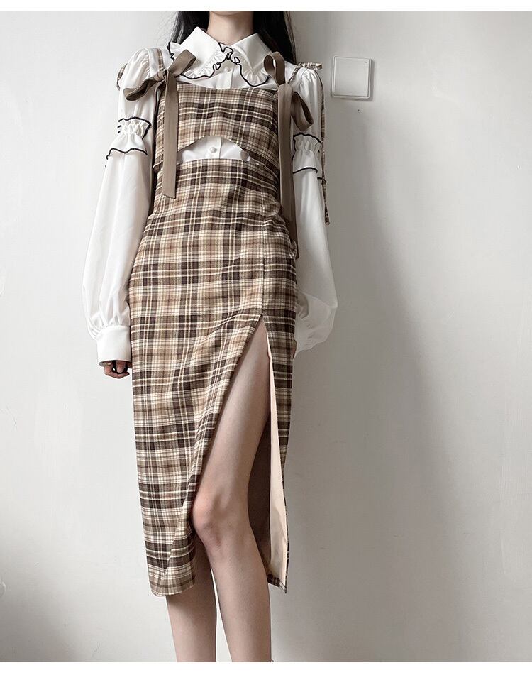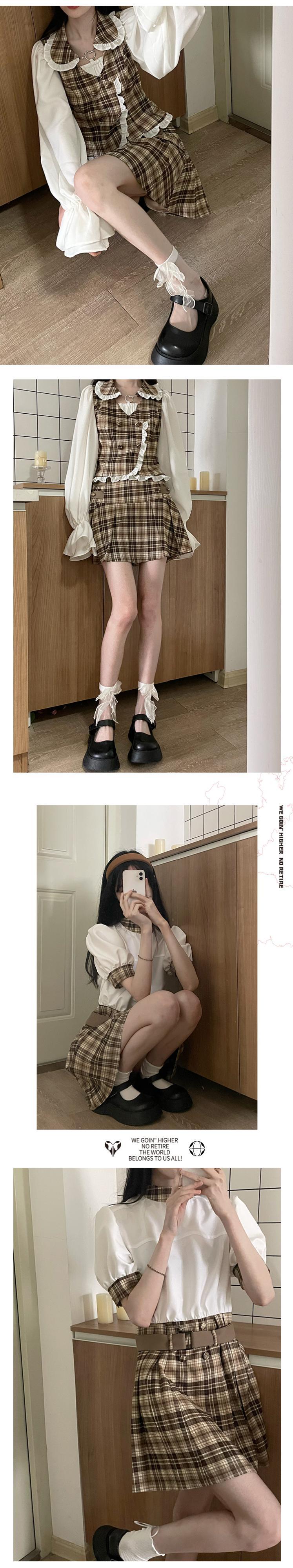 色:レースネック長袖ベビーシャツ,チェック柄スリングドレス,偽の2つのドレス,ウエストベストフェイクツーピースシャツ,チェック柄スカート