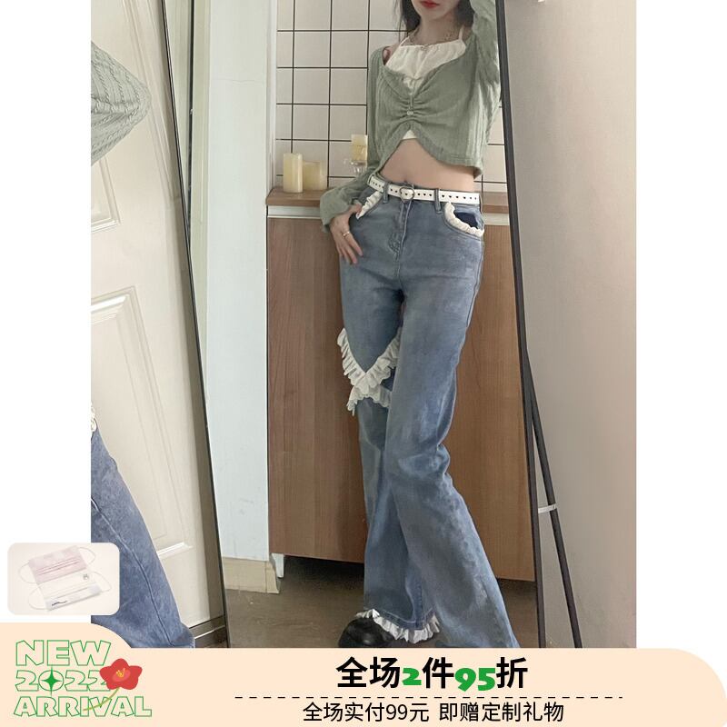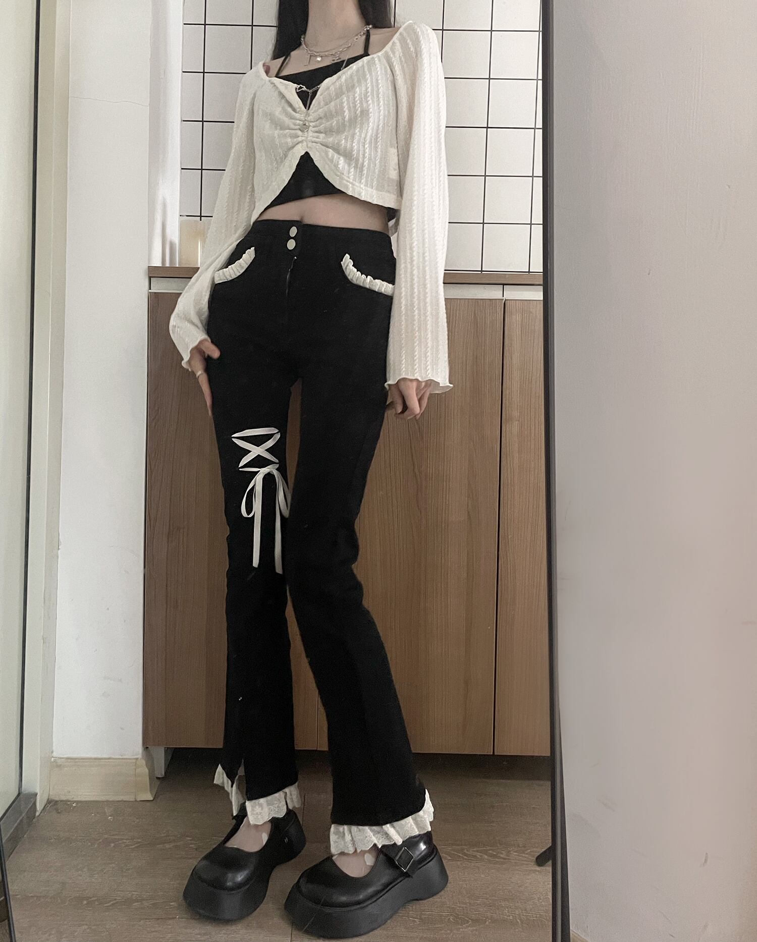 pinksaviorロングレッグデザインスリットレースデコラティブジーンズレディースサマーシンハイウエストフレアワイドレッグパンツ レッド 夏物 PSTB20851783596