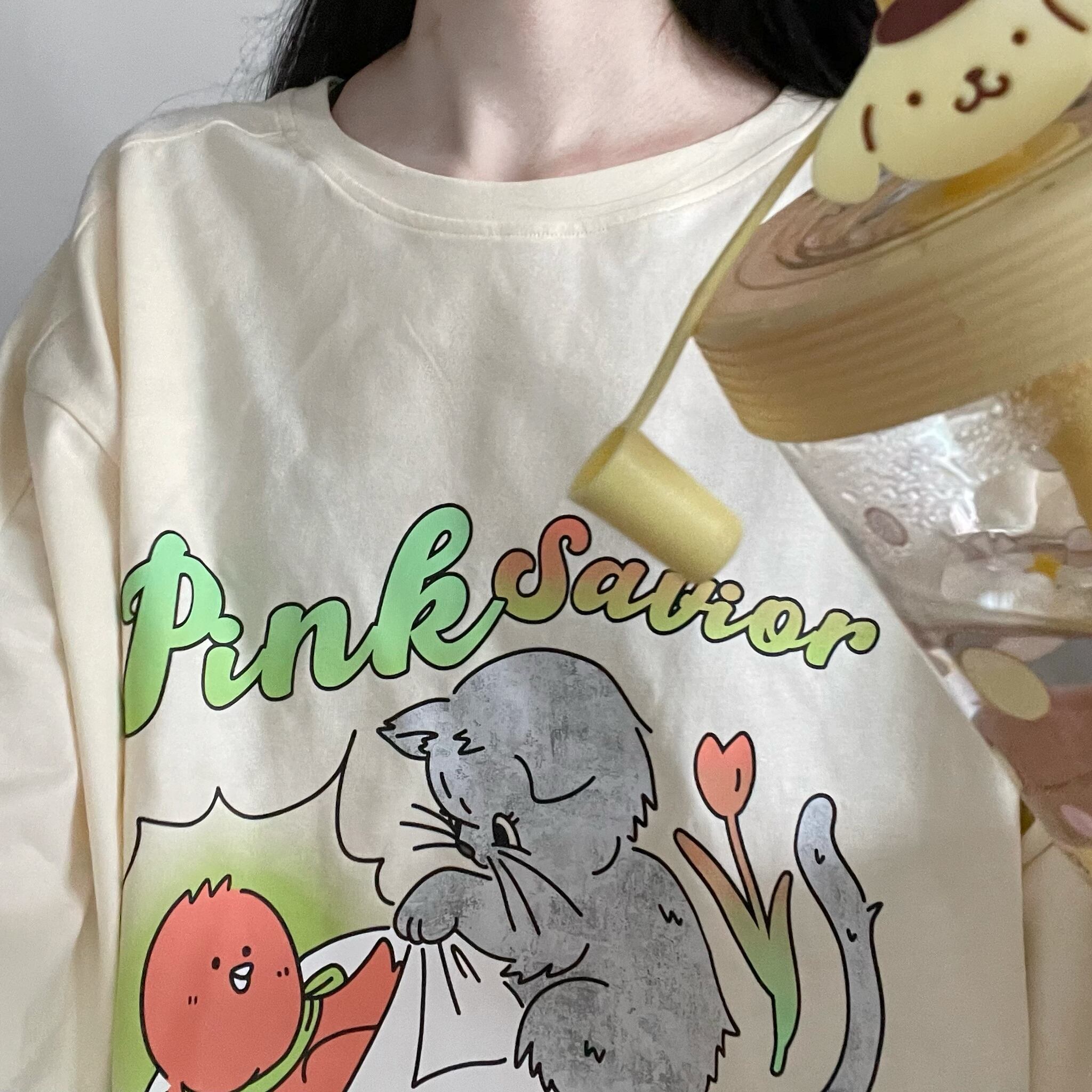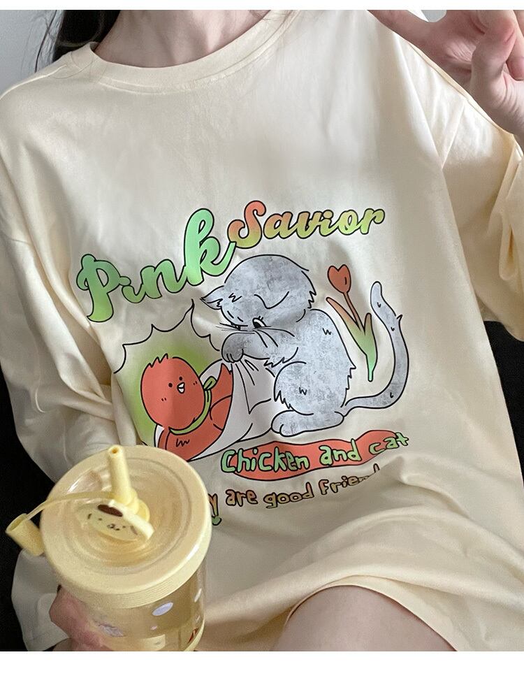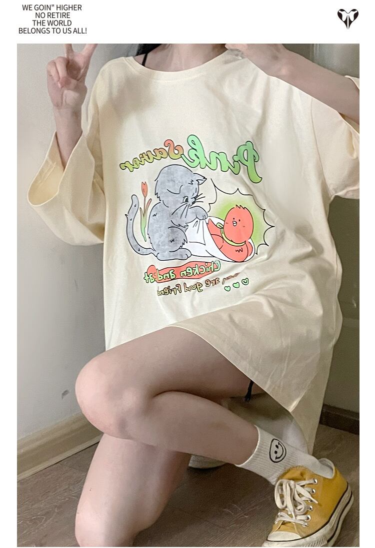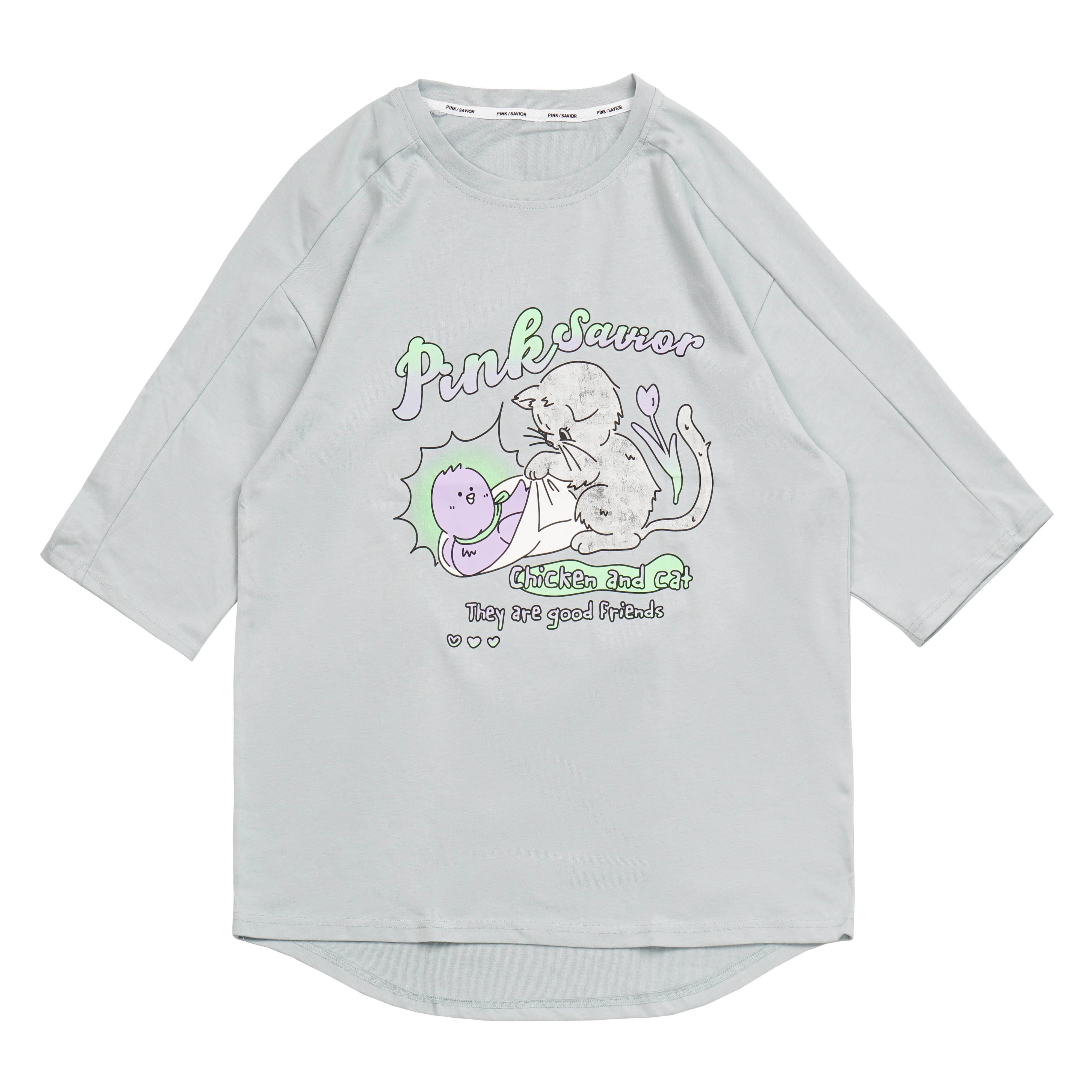 pinksavior夏の猫のボトムス夏の半袖Tシャツ女性のミドル丈ルーズ七分袖トップが欠けています サマー 夏物 PSTB69844560387
