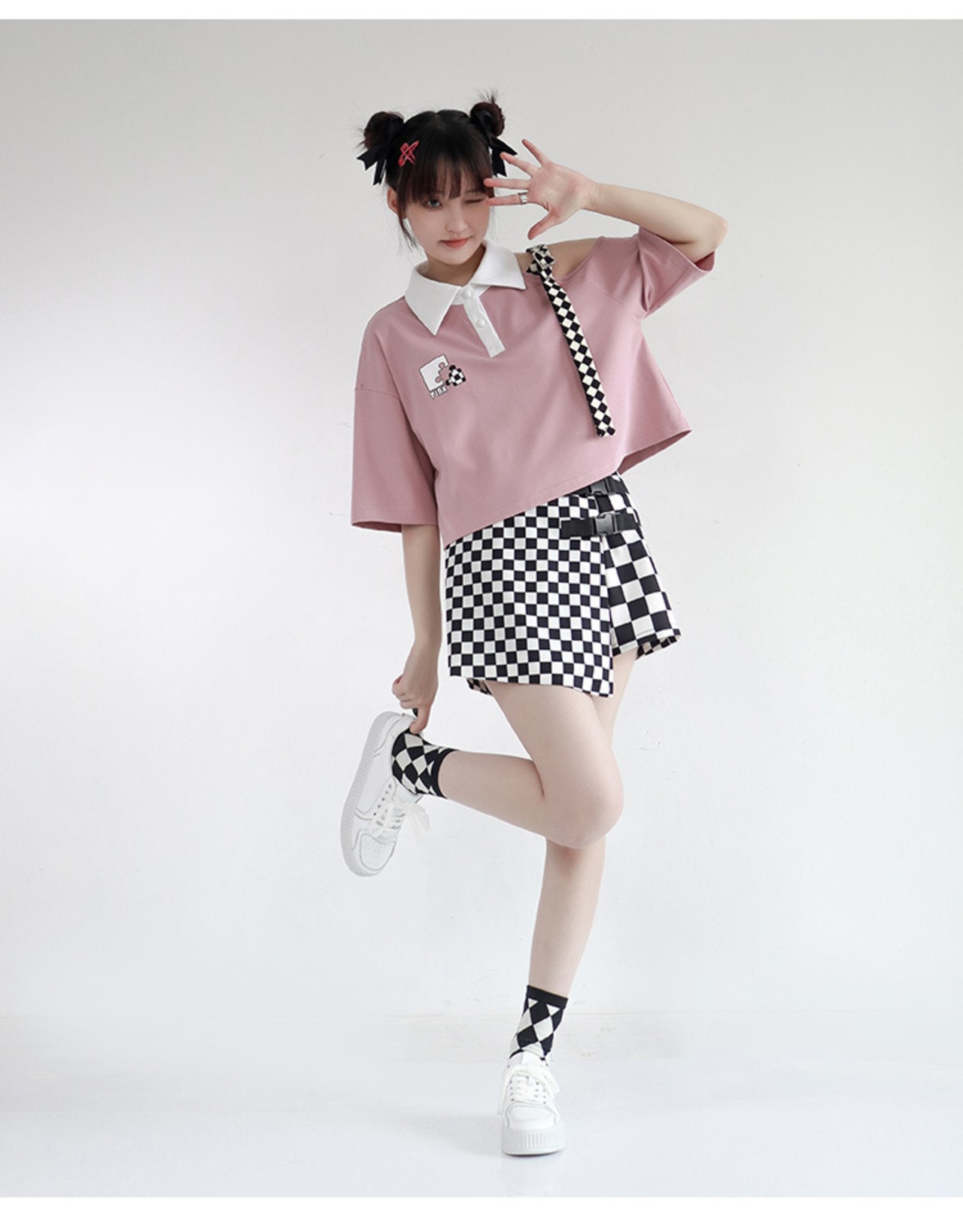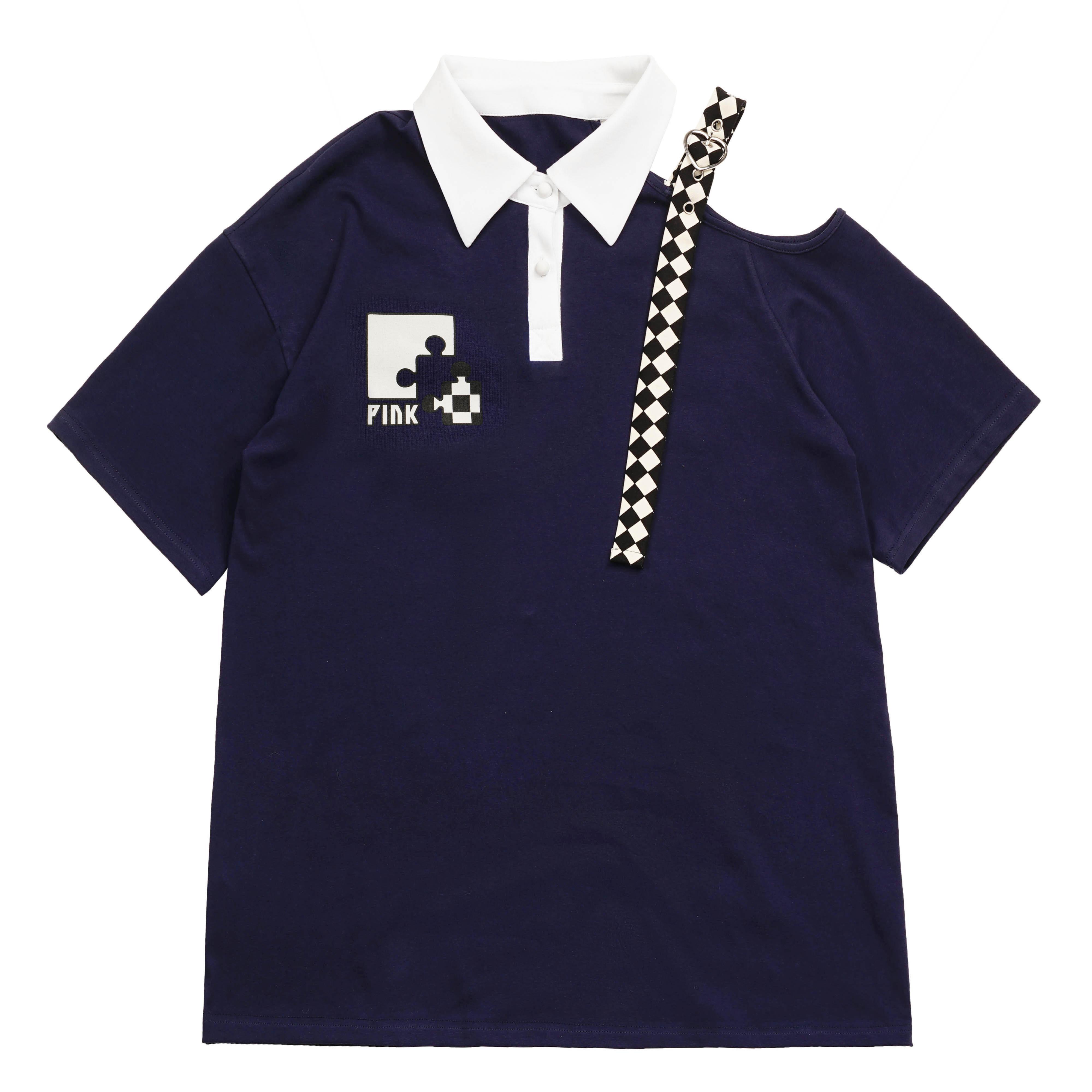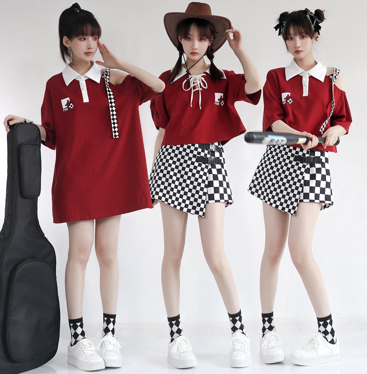 色:ネイビーブルーロングT,ネイビーブルーのショートT,ピンクロングT,ピンクショートT,レッドロングT,レッドショートT,ネイビーブルーのネクタイ半袖,ピンクのネクタイ半袖,赤いネクタイ半袖,チェック柄パネルスカート