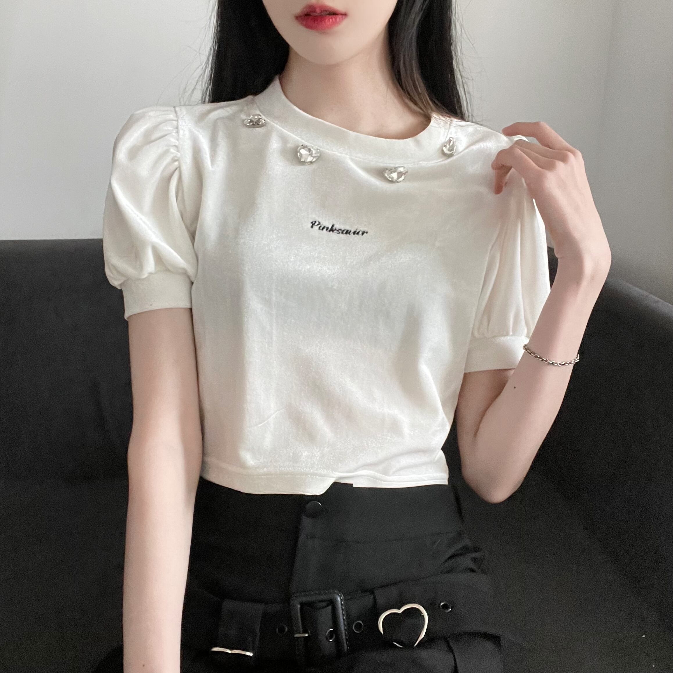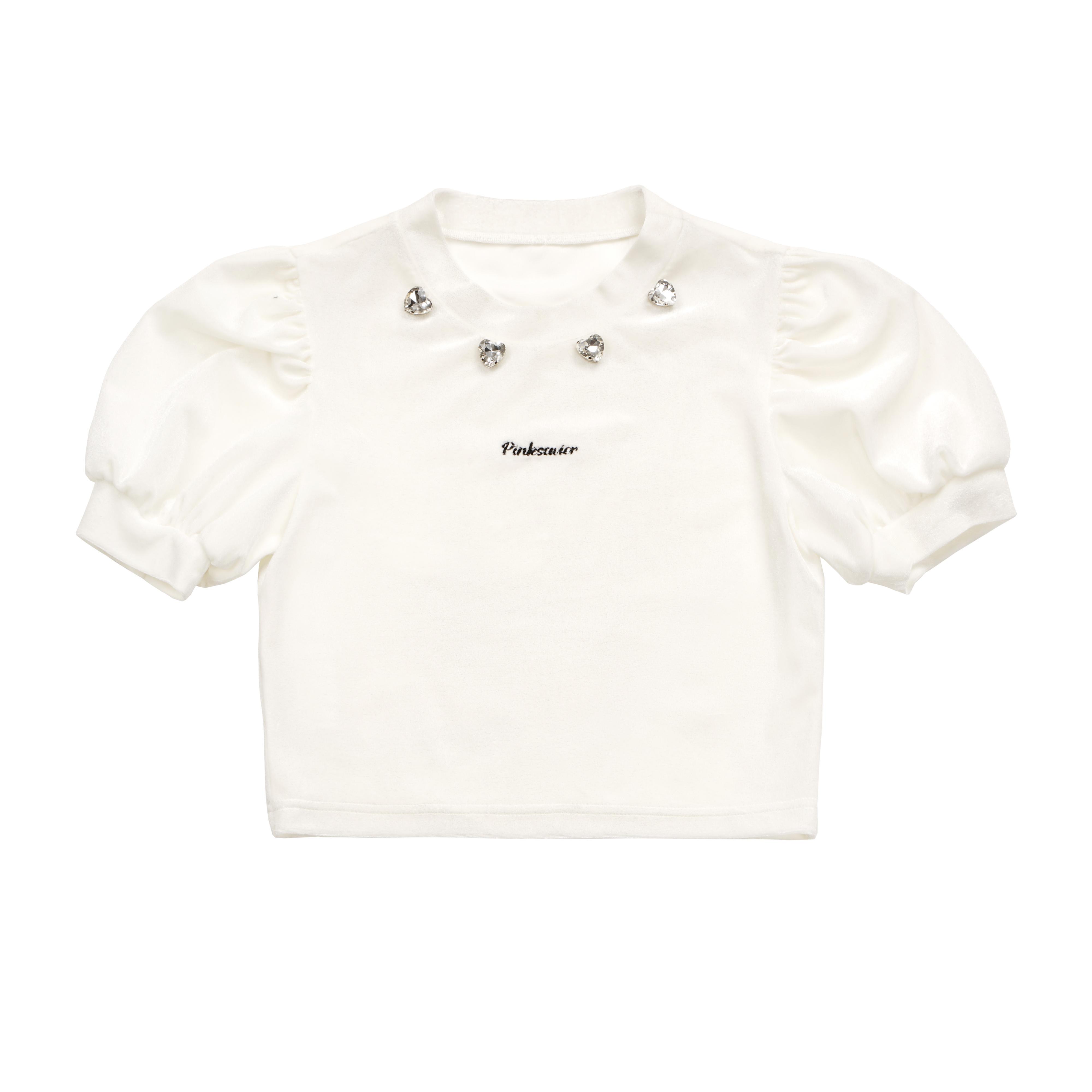 pinksavior[オレンジサンセット]ベルベットラブジェム刺?パフスリーブサマーホワイトオレンジ半袖 ショート ピンク レッド ハーフスリーブ 刺繍 夏物 PSTB39140813649
