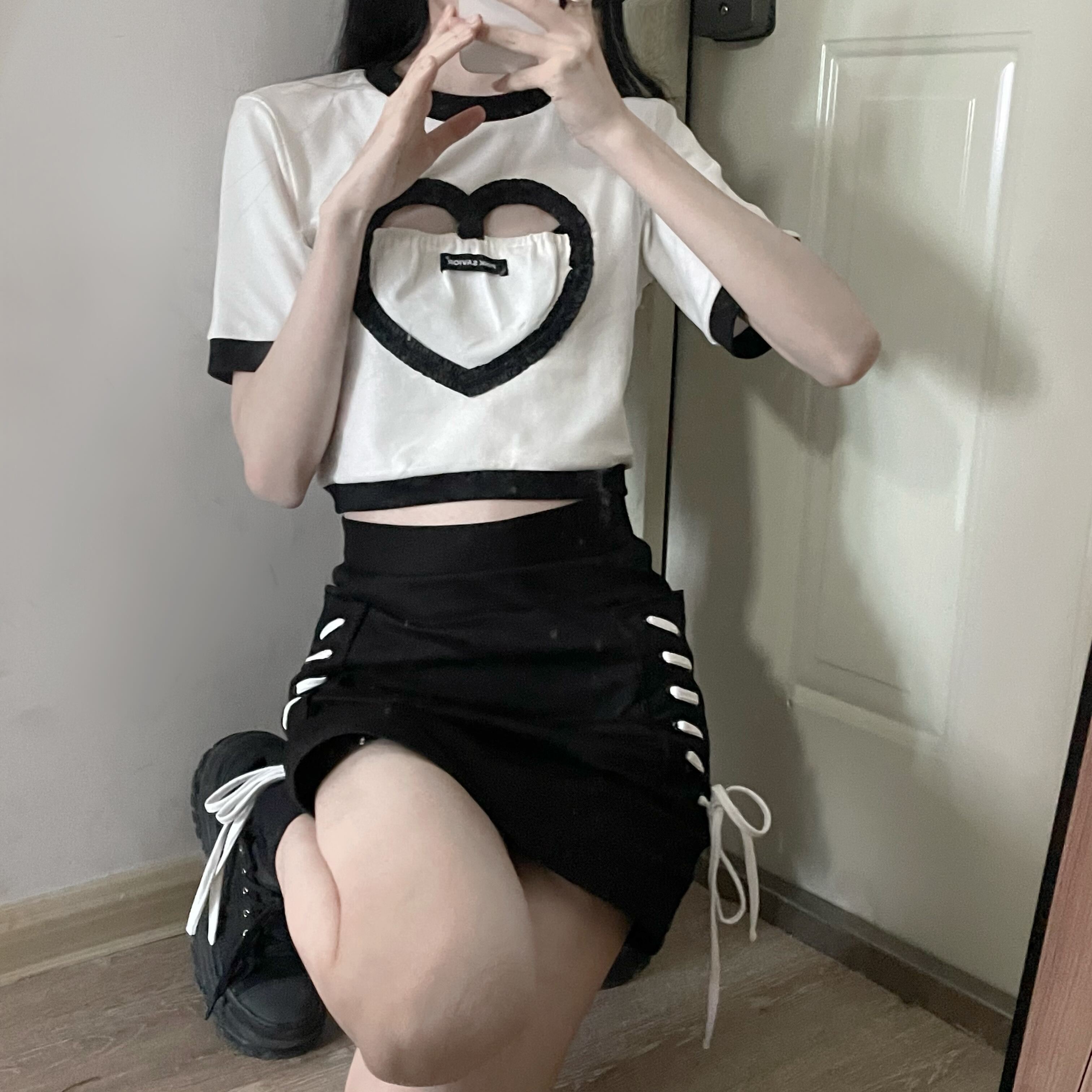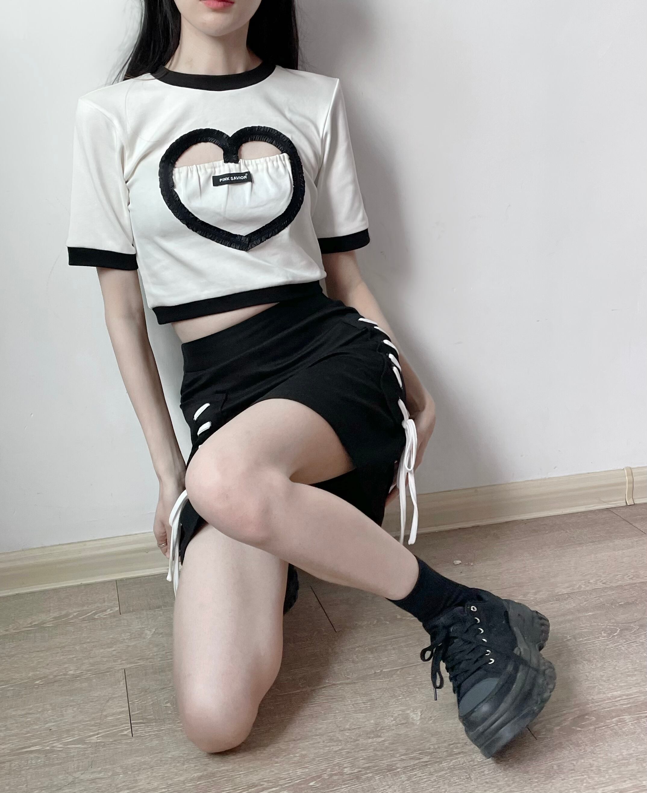 pinksaviorハート中空フェイクツーピーススプリットトップスカートサマースーツ 夏物 PSTB81428045643