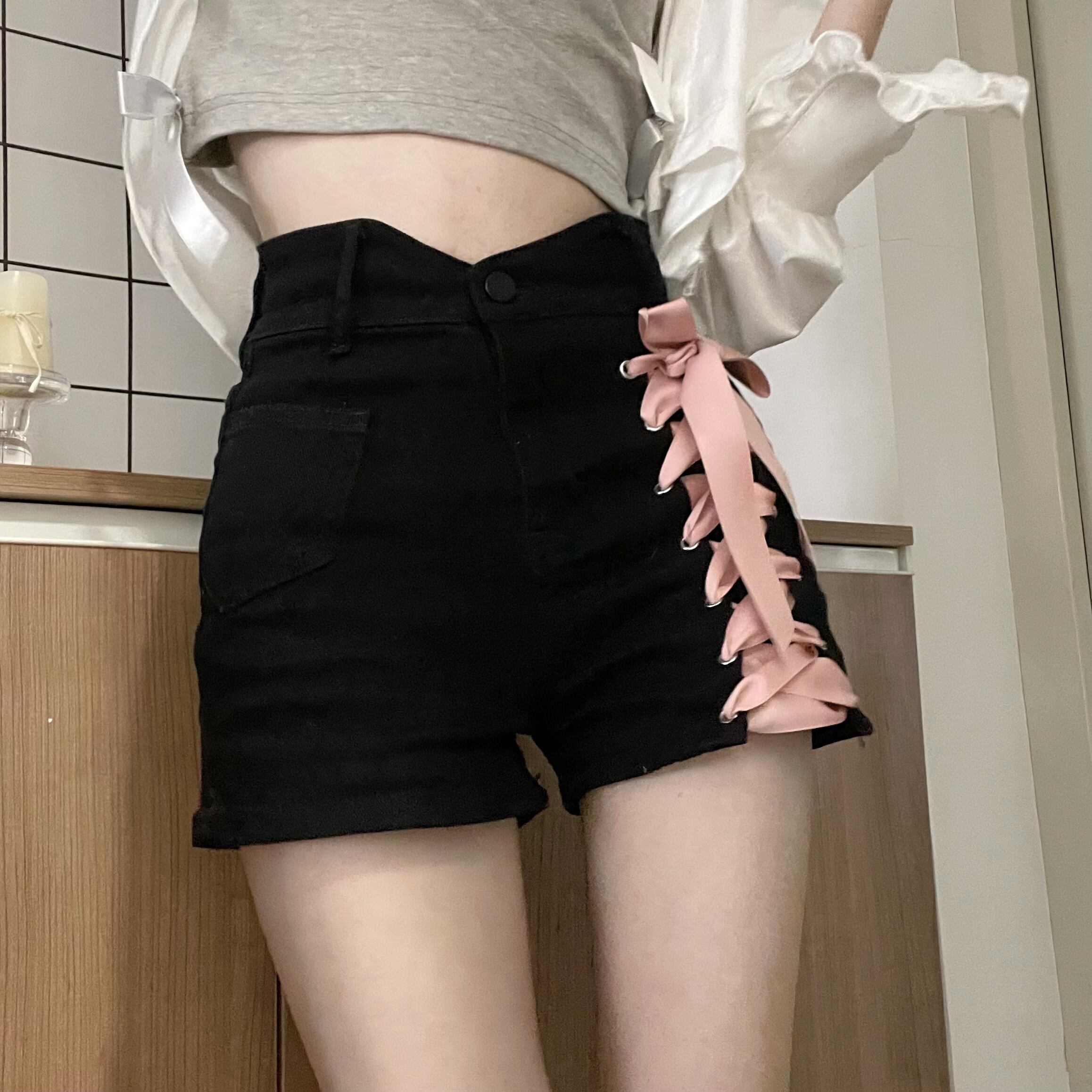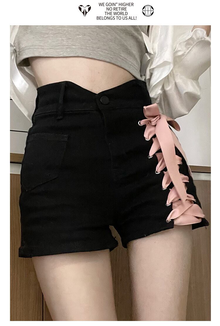 pinksaviorピンクの包帯の装飾夏のジーンズ黒と青の小さなパンツショーツ女性のハイウエスト細い言葉 ハイウェスト ブルー ブラック サマー 夏物 ブルマー PSTB57504013586