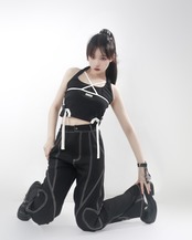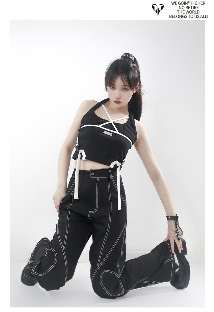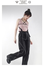 pinksaviorコンセプトアートトップラインデザインハートデコレーションブラックドレープサマーワークロングレッグパンツ 夏物 PSTB9179633181