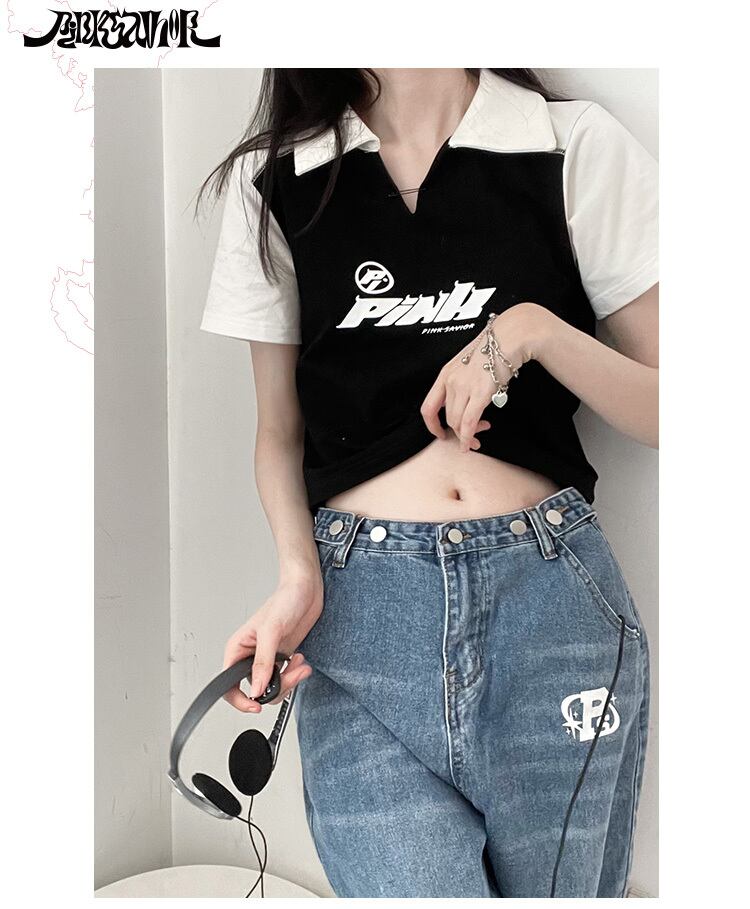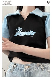 pinksaviorブルーとブラックのカラーブロックラグランカラースリムフィットストレッチコットンサマー半袖 ショート ハーフスリーブ 夏物 PSTB11214489533