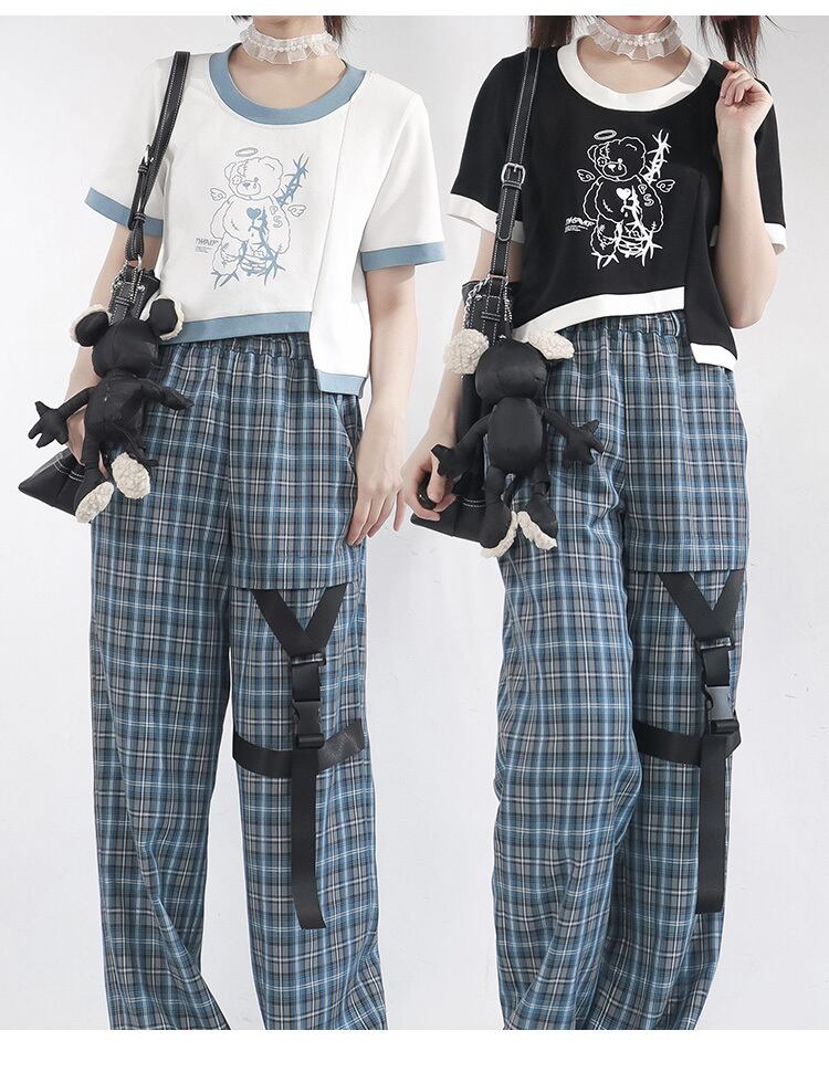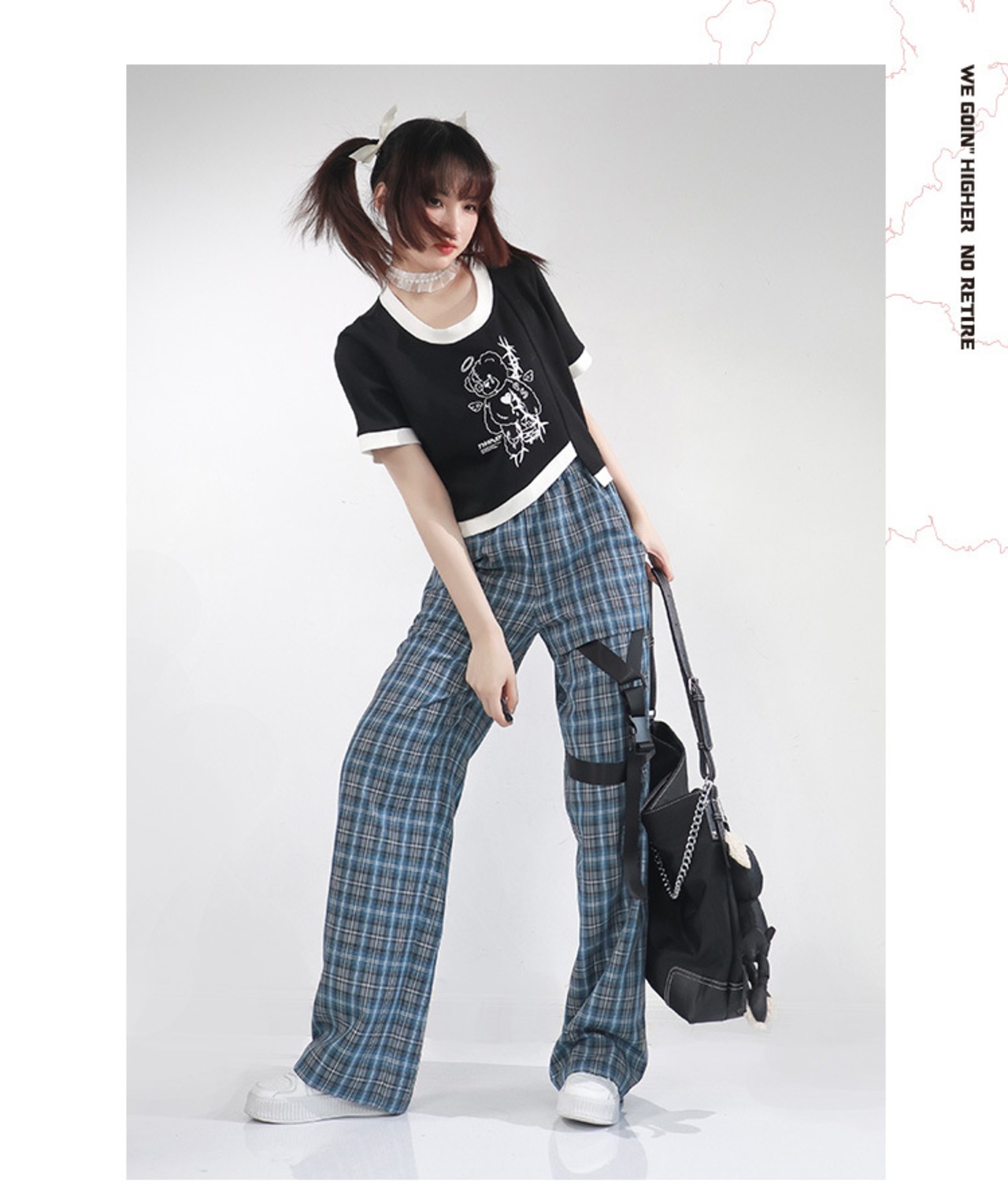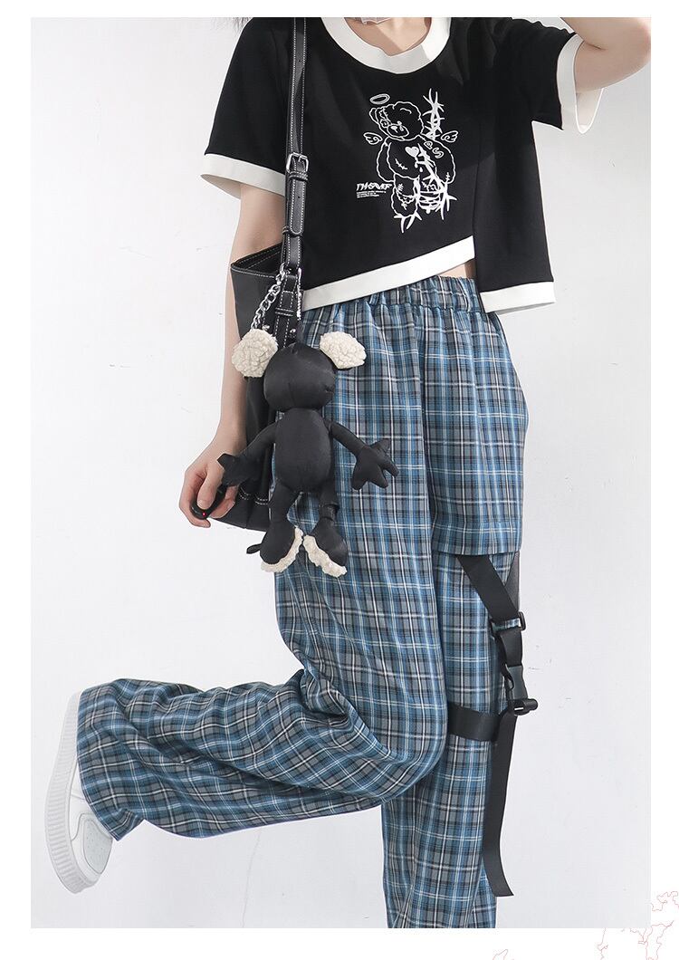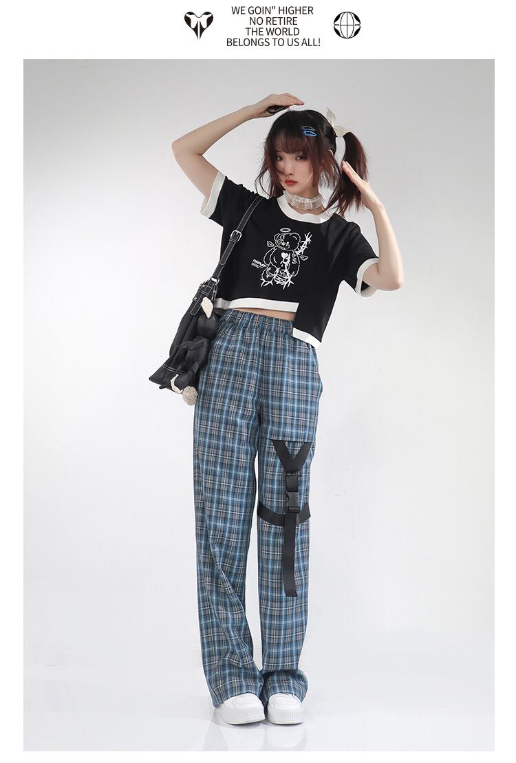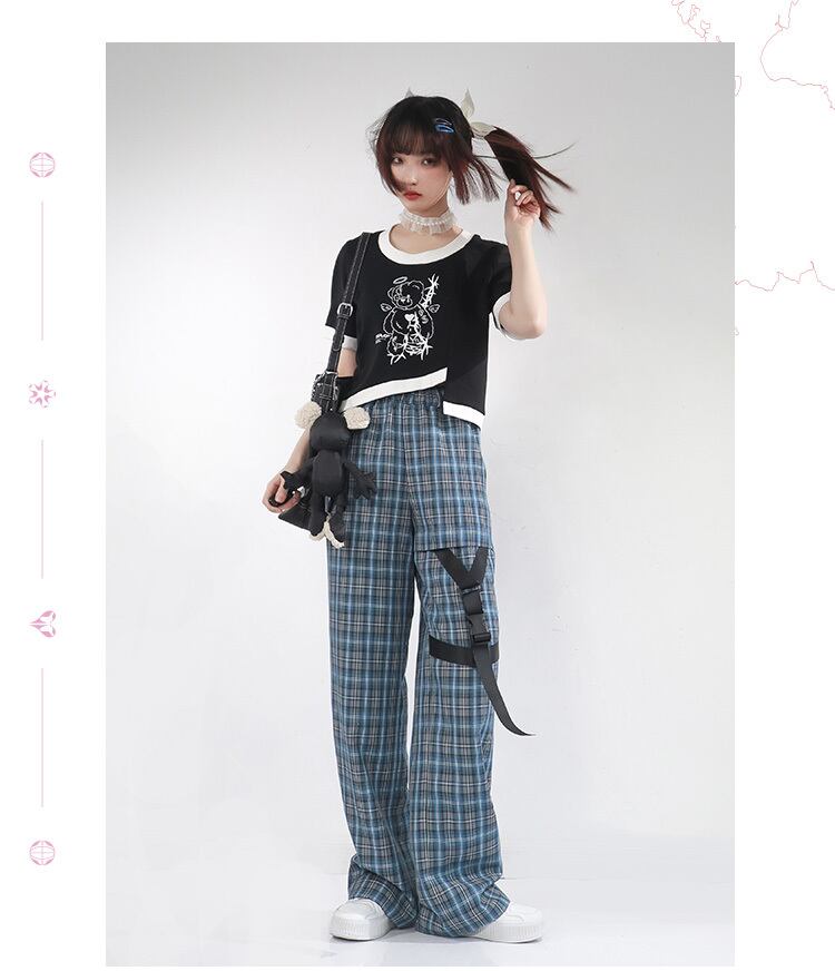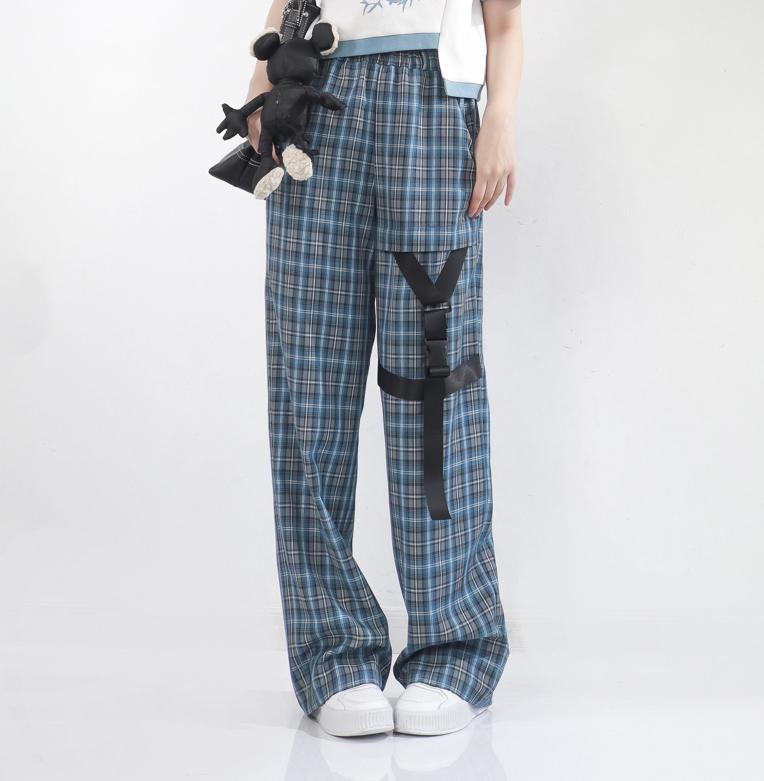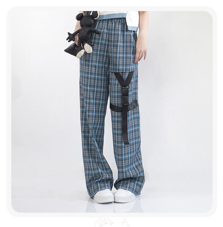 pinksaviorブルーサマーフレッシュチェック柄デコラティブベルトカジュアルパンツ 夏物 ハーネス PSTB26671182900
