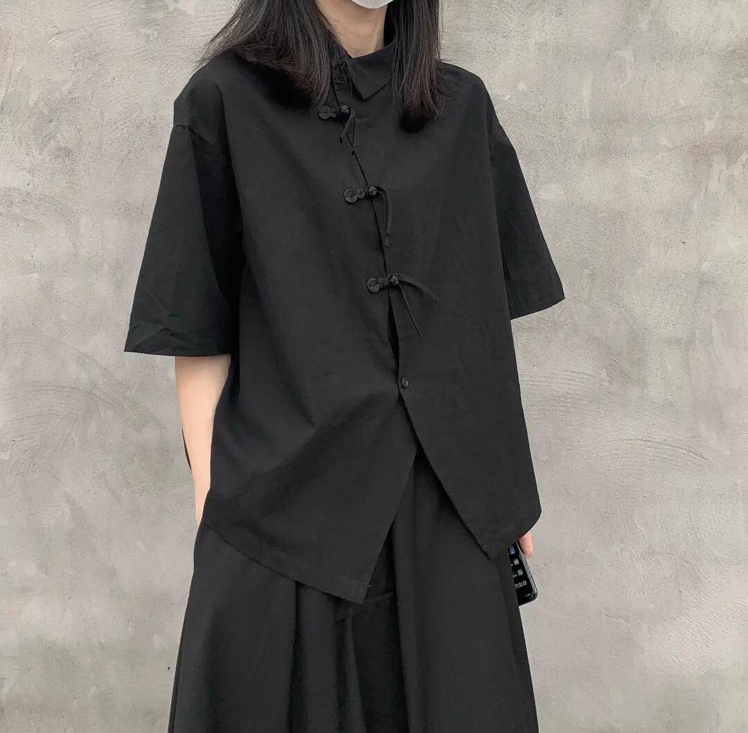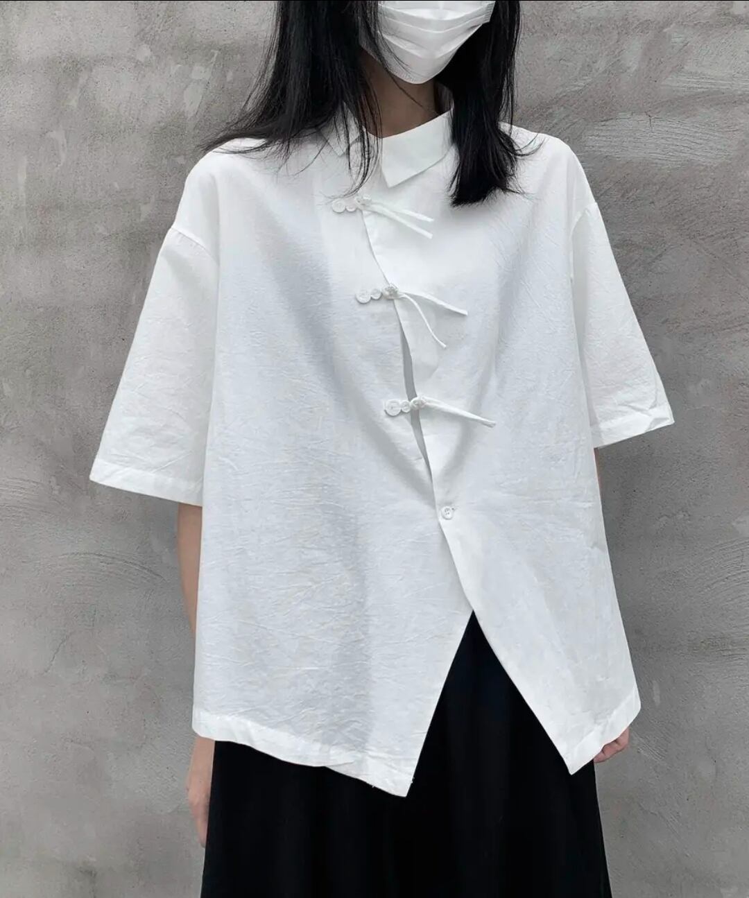 BLANKANDWHITEダークブラックディスクボタンスリットデザイン半袖シャツサマーシンウィメンズチャイニーズニッチトップ ホワイト 夏物 BWTB87998591165
