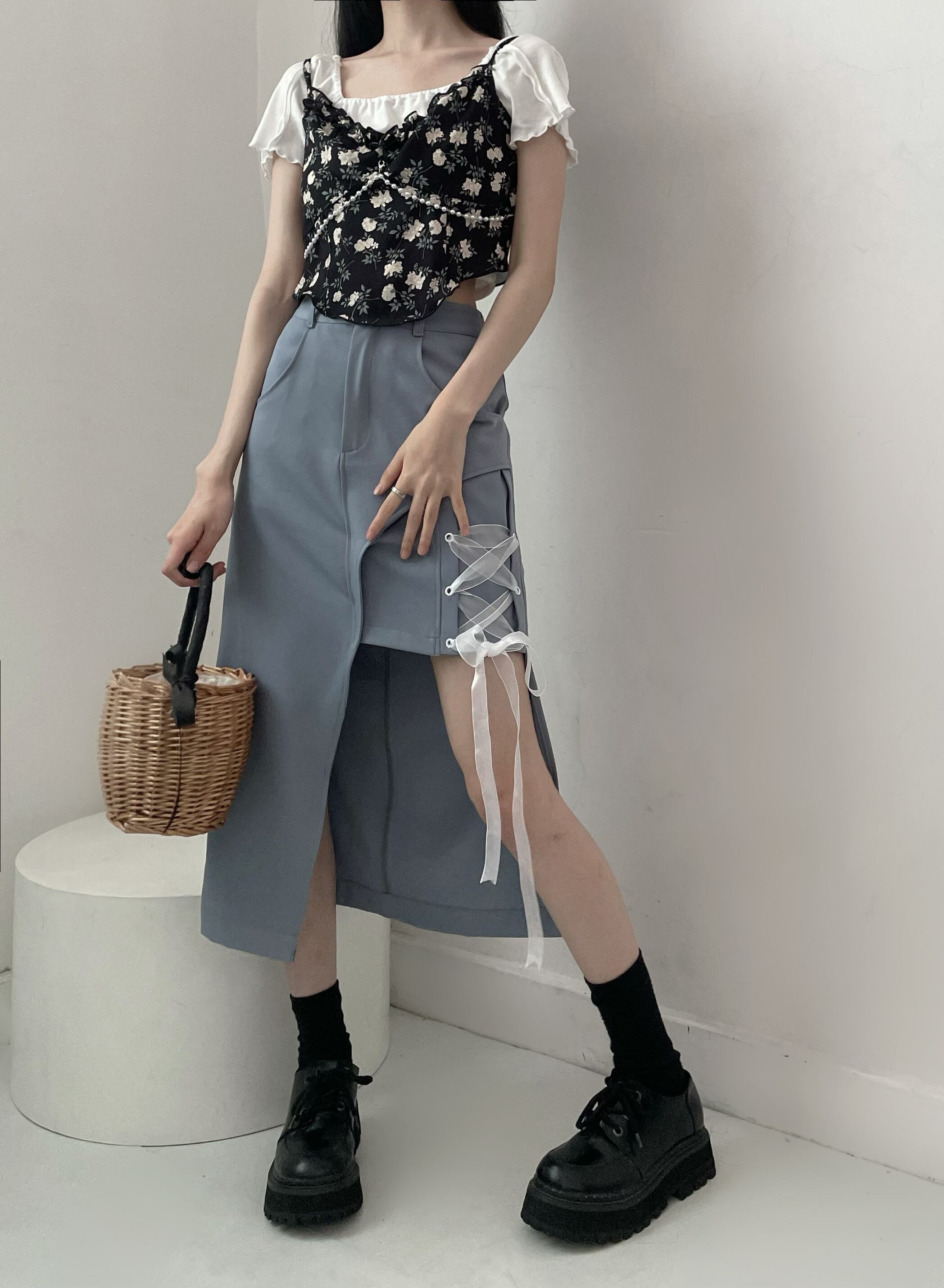 色:フローラルキャミソール,裾が不規則なツーピース半袖,不規則なロングスカート,パールパンツ