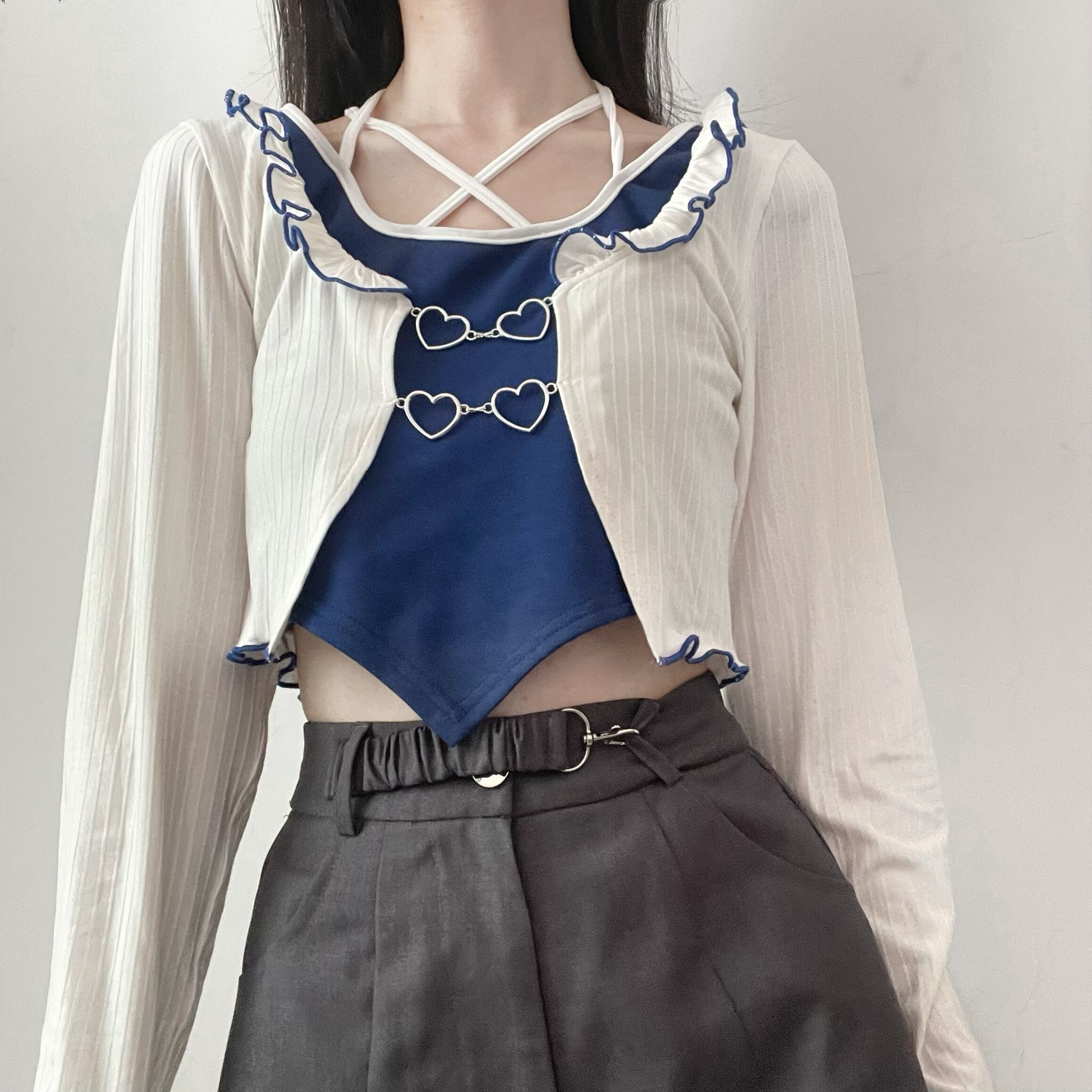 色:白いカーディガン,ローズピンクカーディガン,ロイヤルブルーベスト,ブルゴーニュベスト,ダークグレーのショートパンツに合わせて