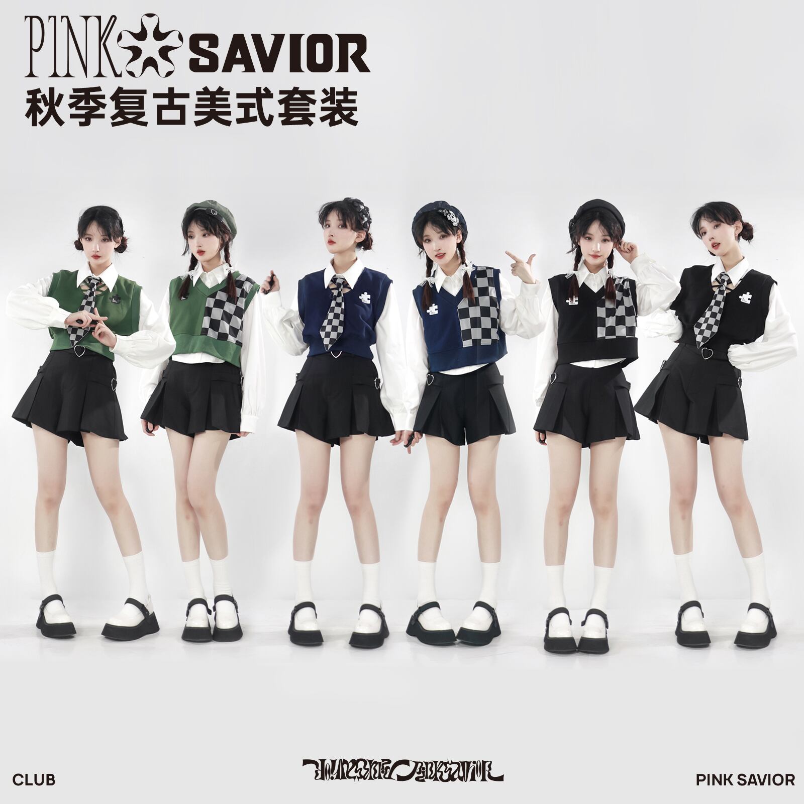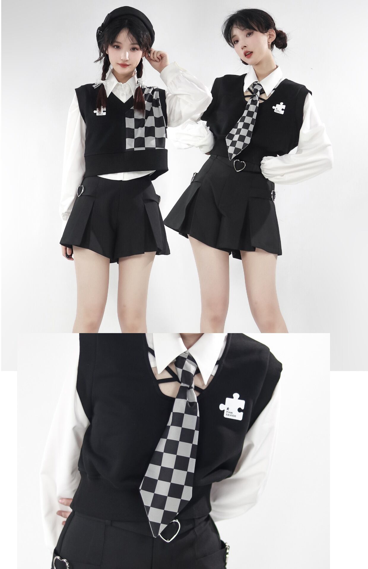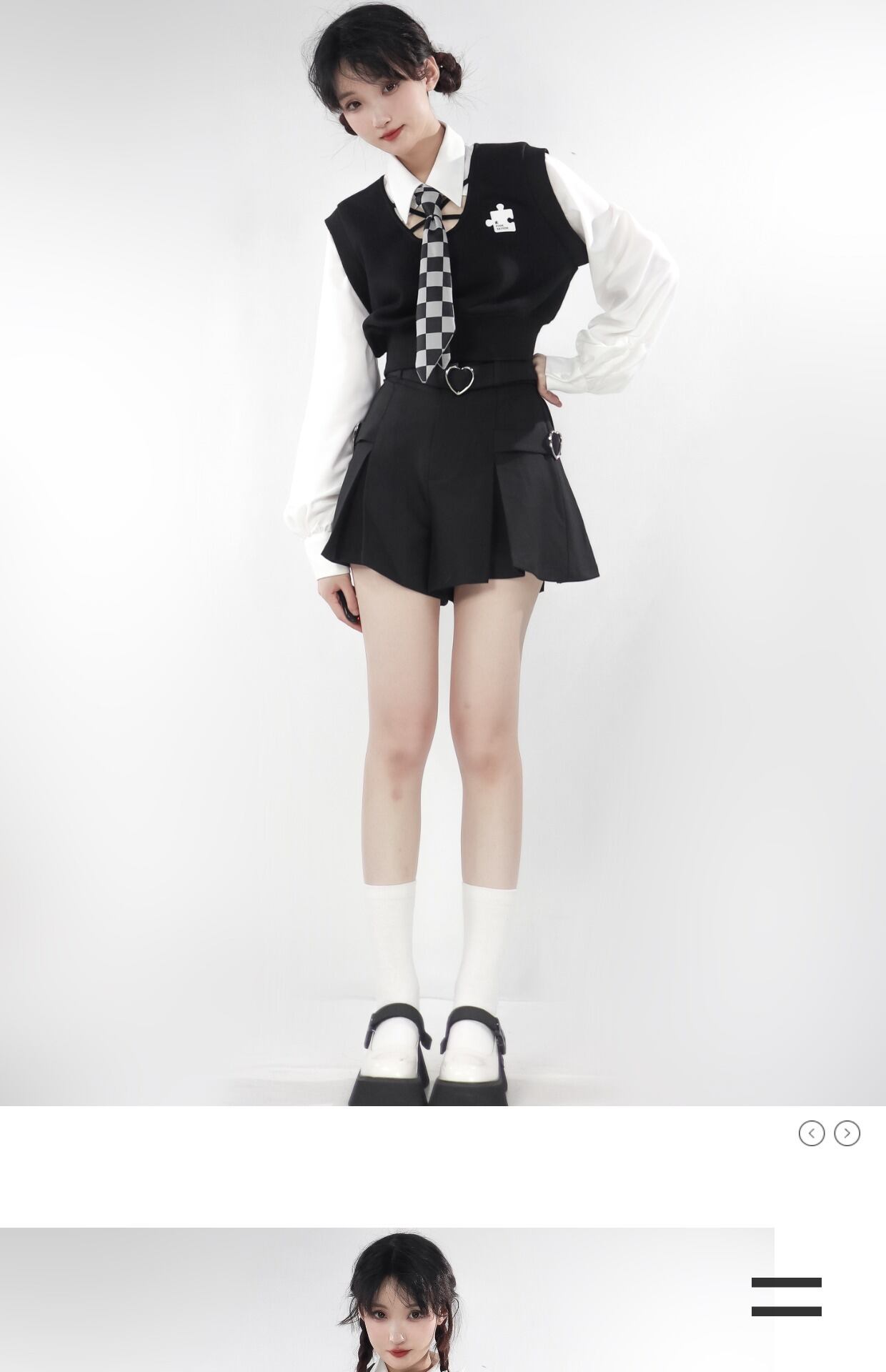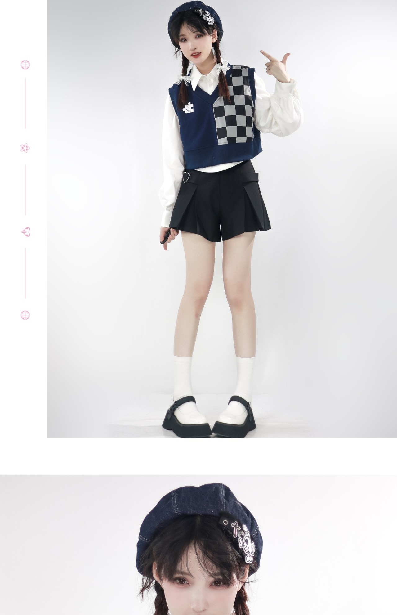 色:グリーングレーブラックチェッカーボードベスト,ネイビーブルーとグレーのチェッカーボードベスト,黒とグレーのチェッカーボードベスト,黒キュロット,ブラックフェイクツーピーストップ,グリーンフェイクツーピーストップ,ネイビーブルーのフェイクトップス,白のショートシャツ