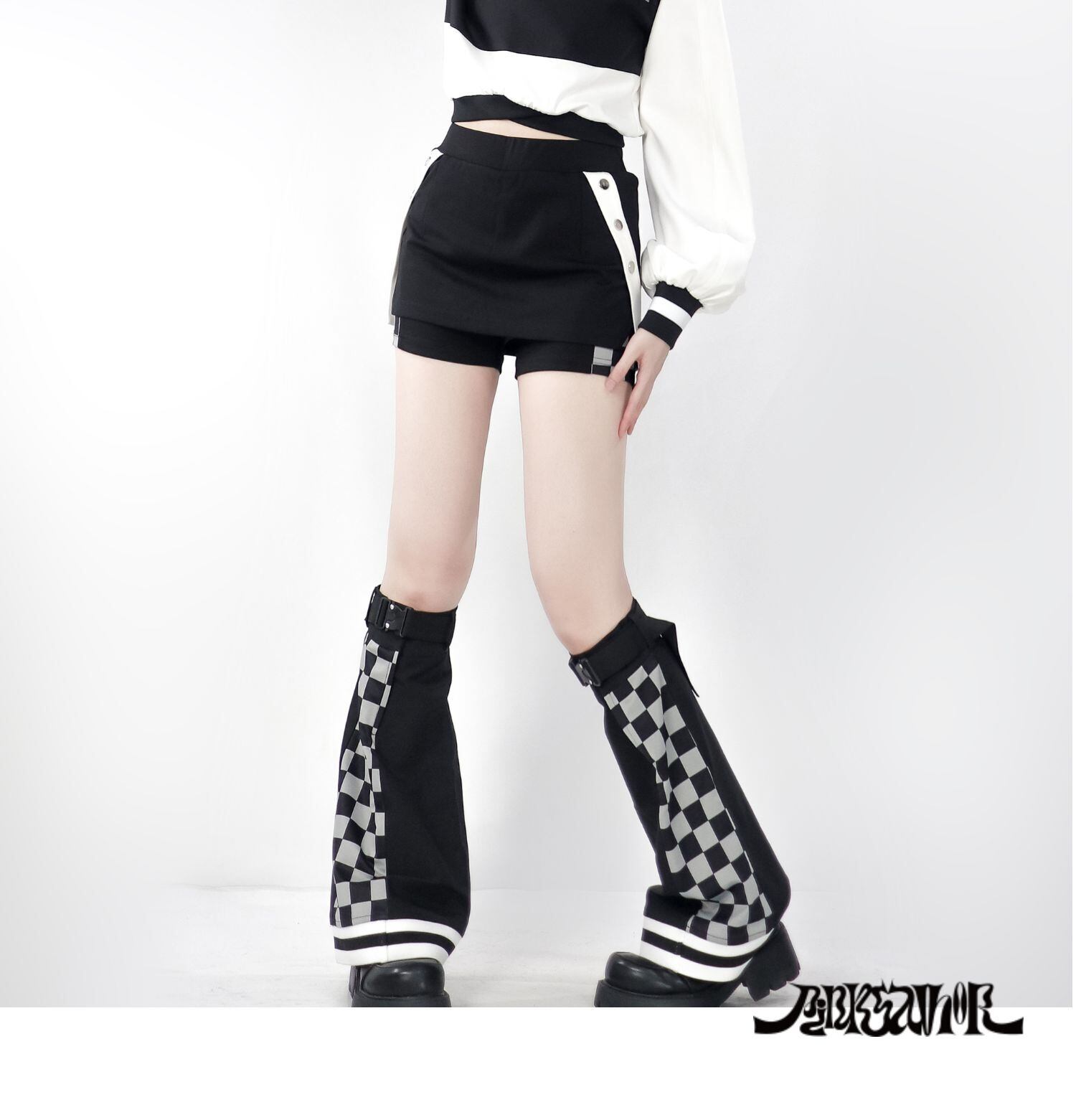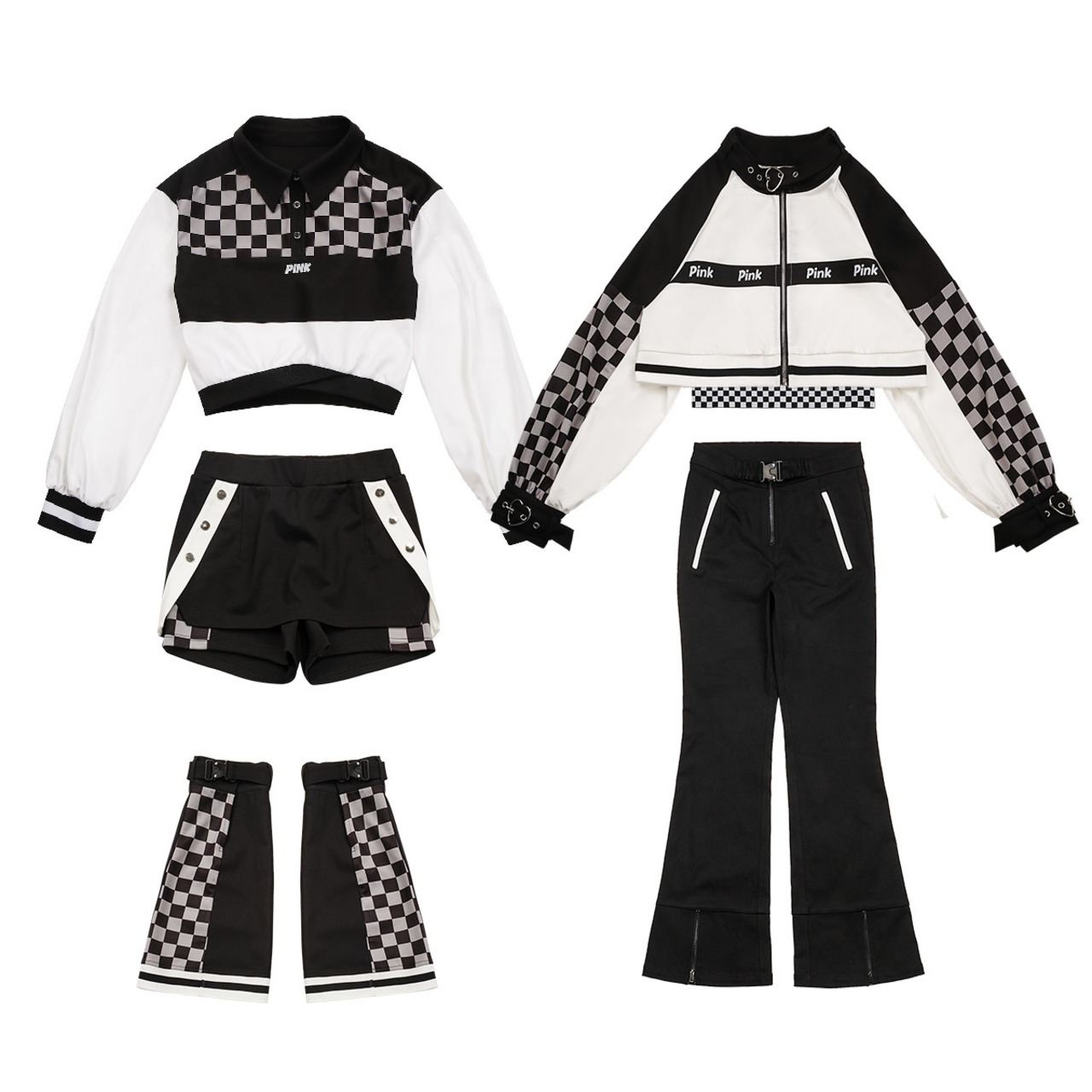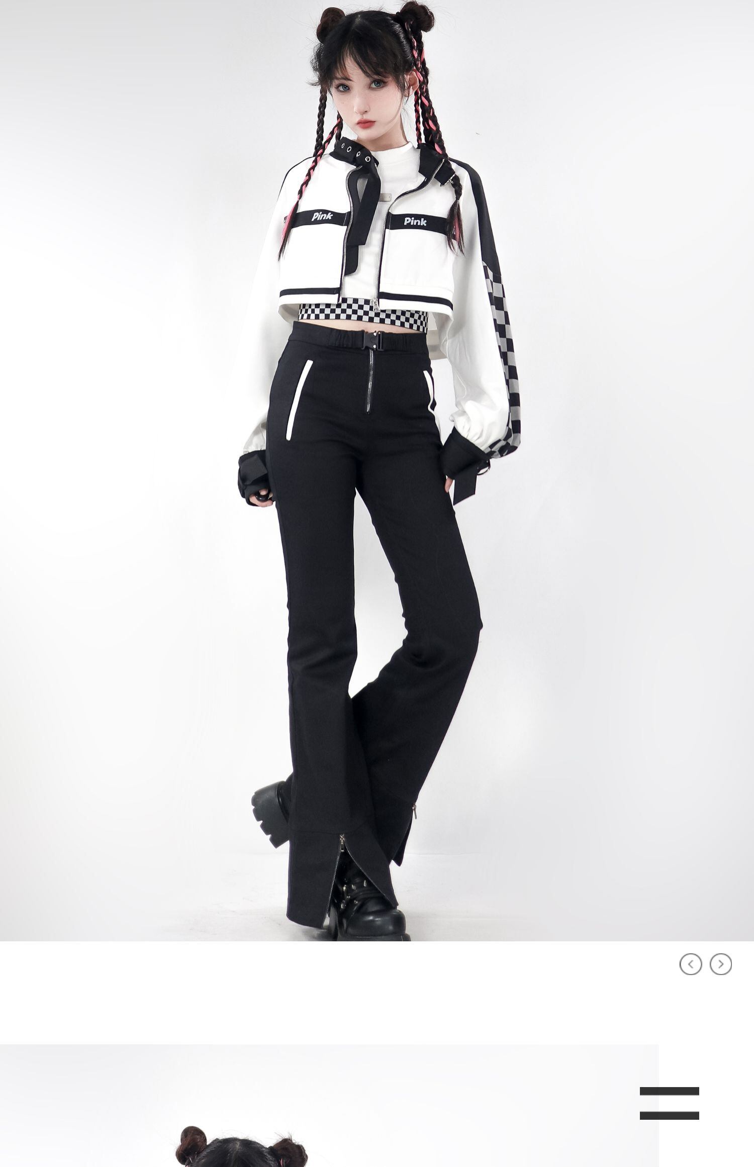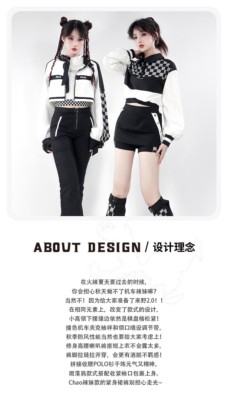 色:プルオーバー長袖トップ,キュロット,ラグランショートバイカージャケット,スリムベース,スリムフィットの黒のズボン,装飾レッグカバー