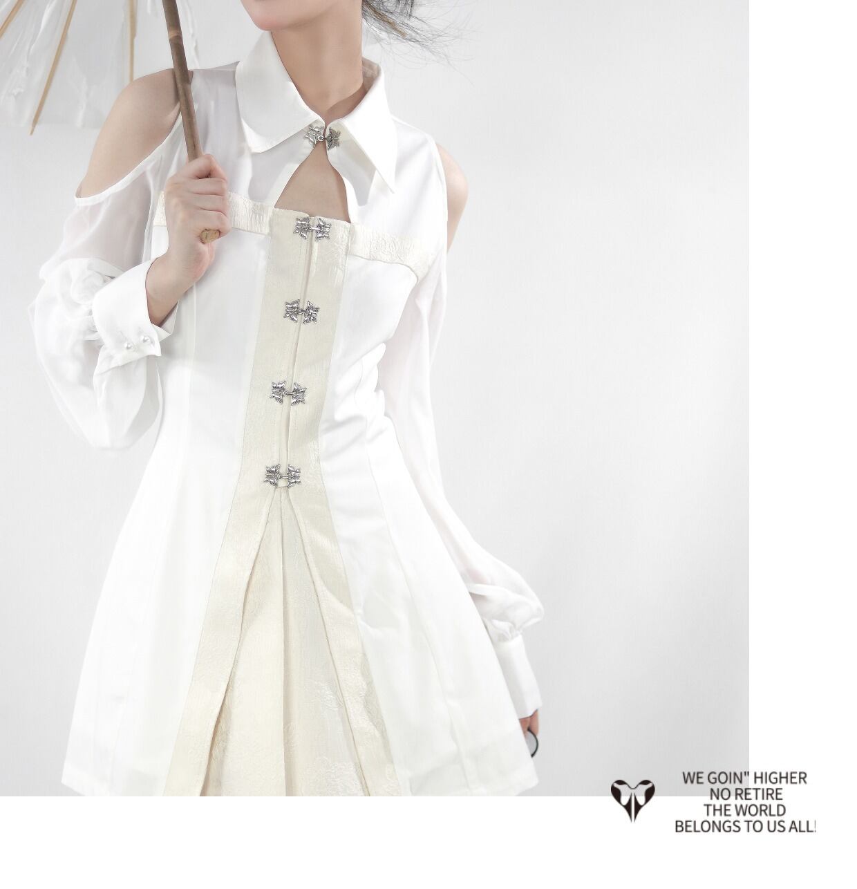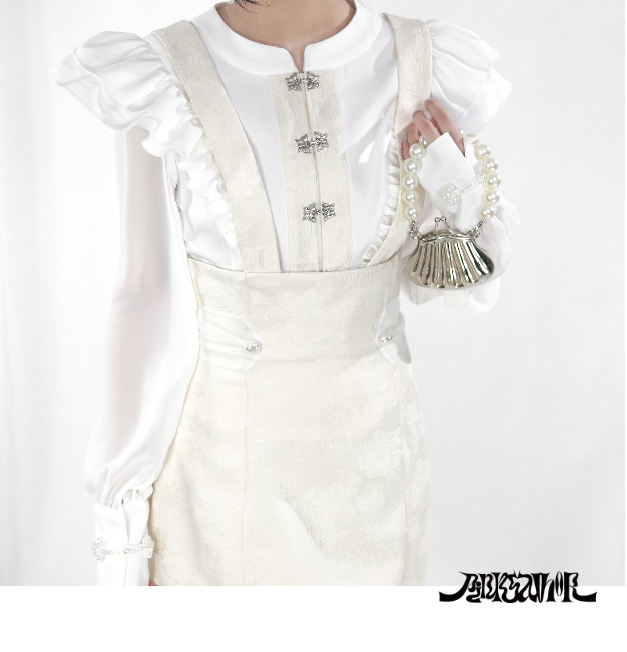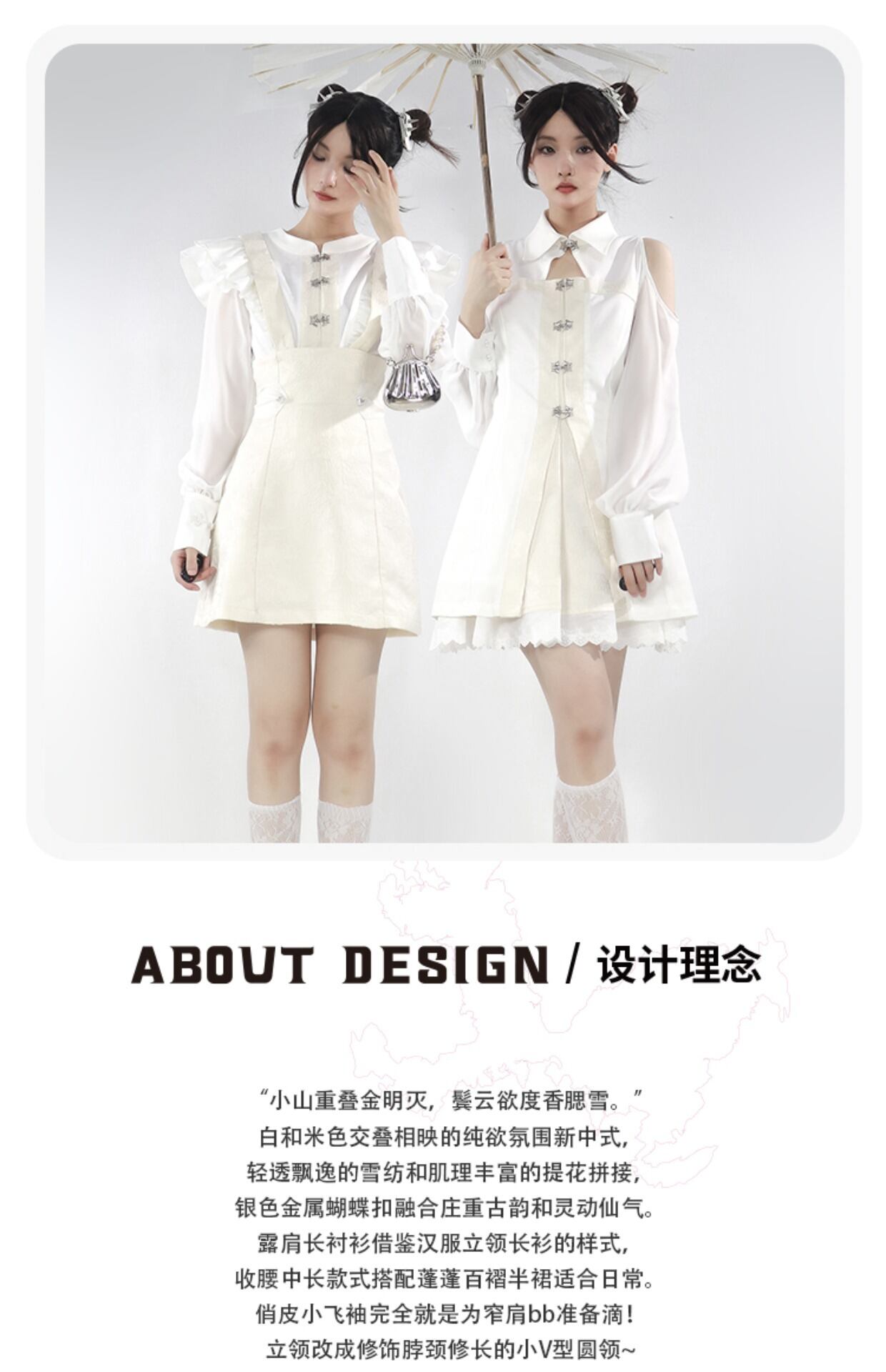 pinksavior [Mianmian] 新中国風 - ショルダー ロングスリーブ サスペンダー スカート シフォン 蝶 合金 装飾 秋 ピンク オータム 秋物 PSTB19241080599