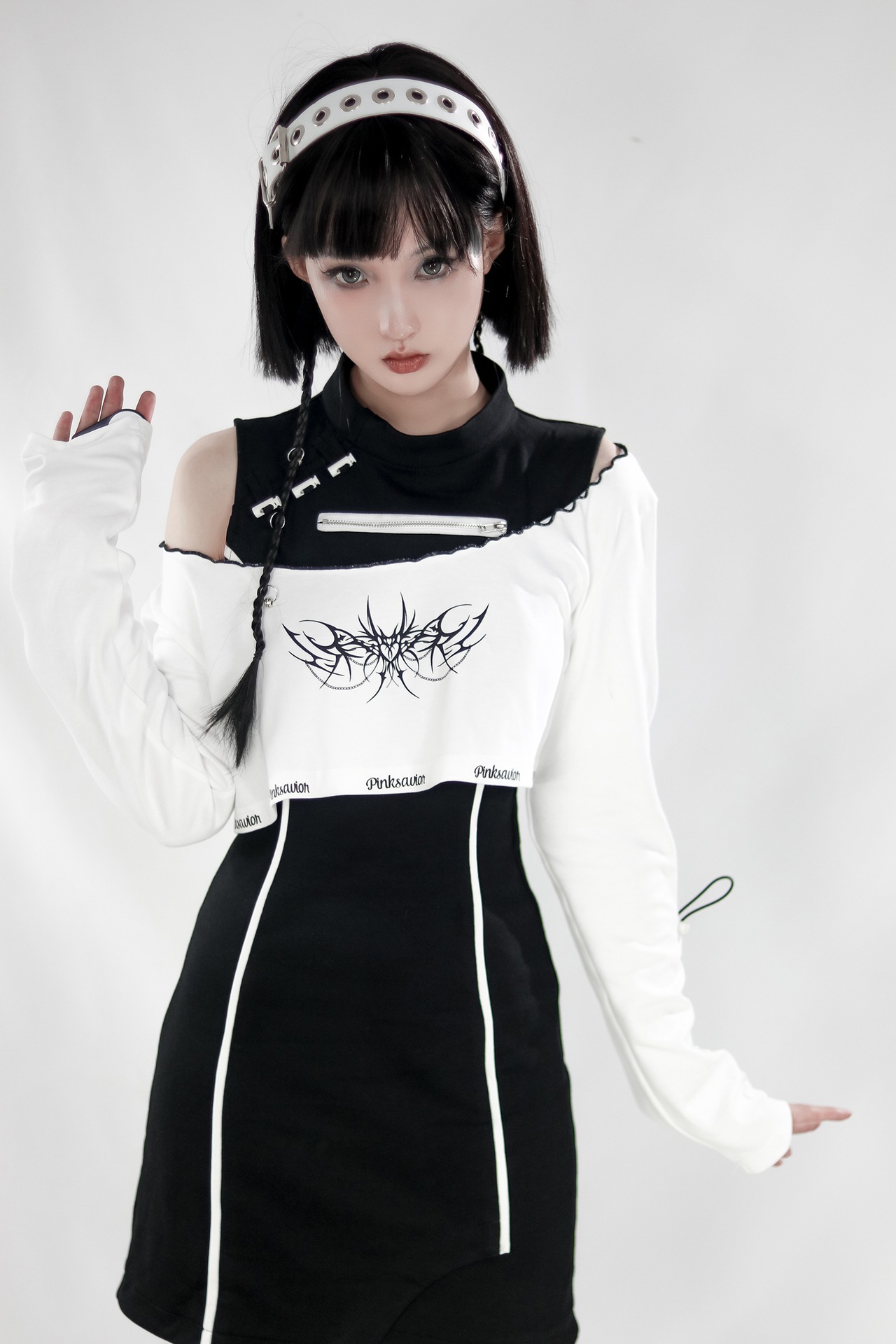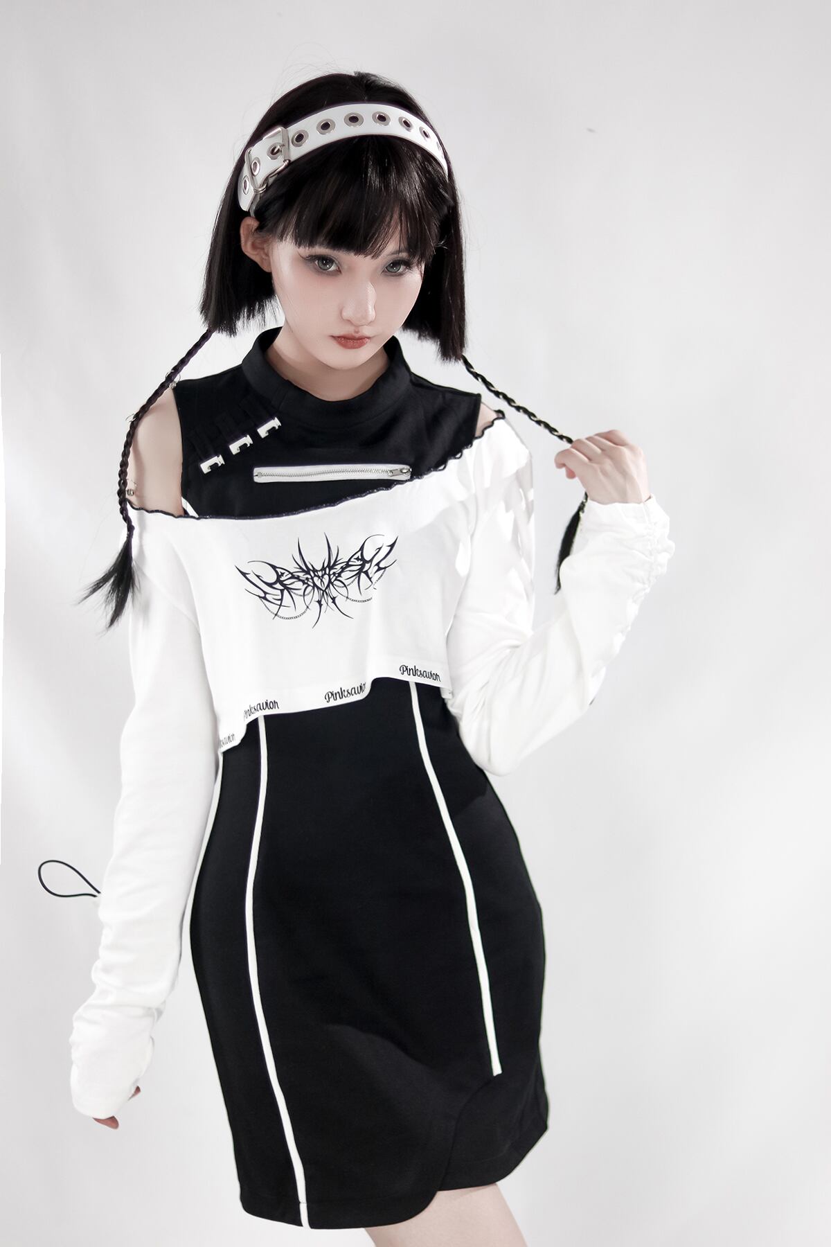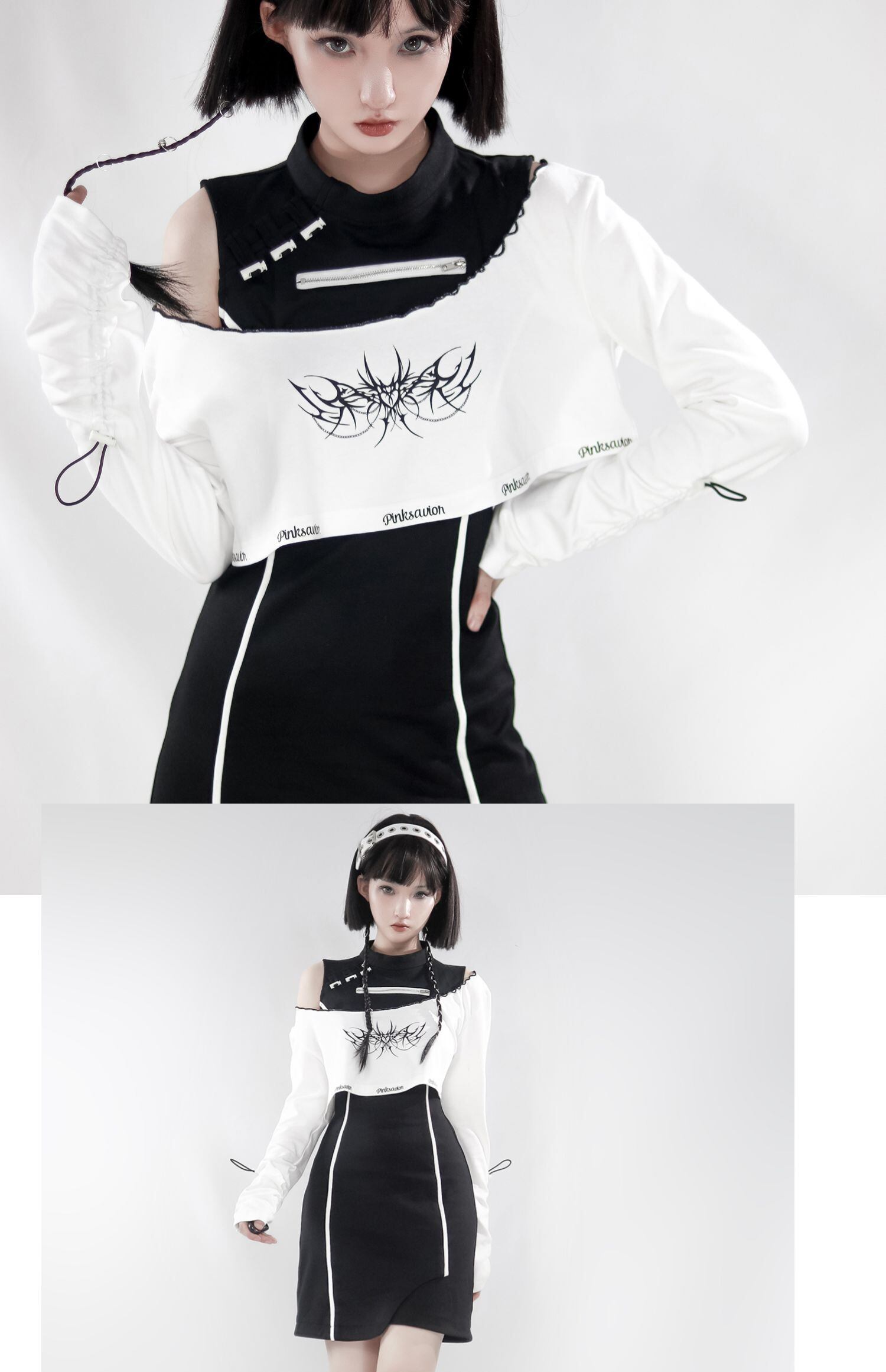 色:黒ウエストチャイナ,ホワイトスロープショルダーボンバートップ