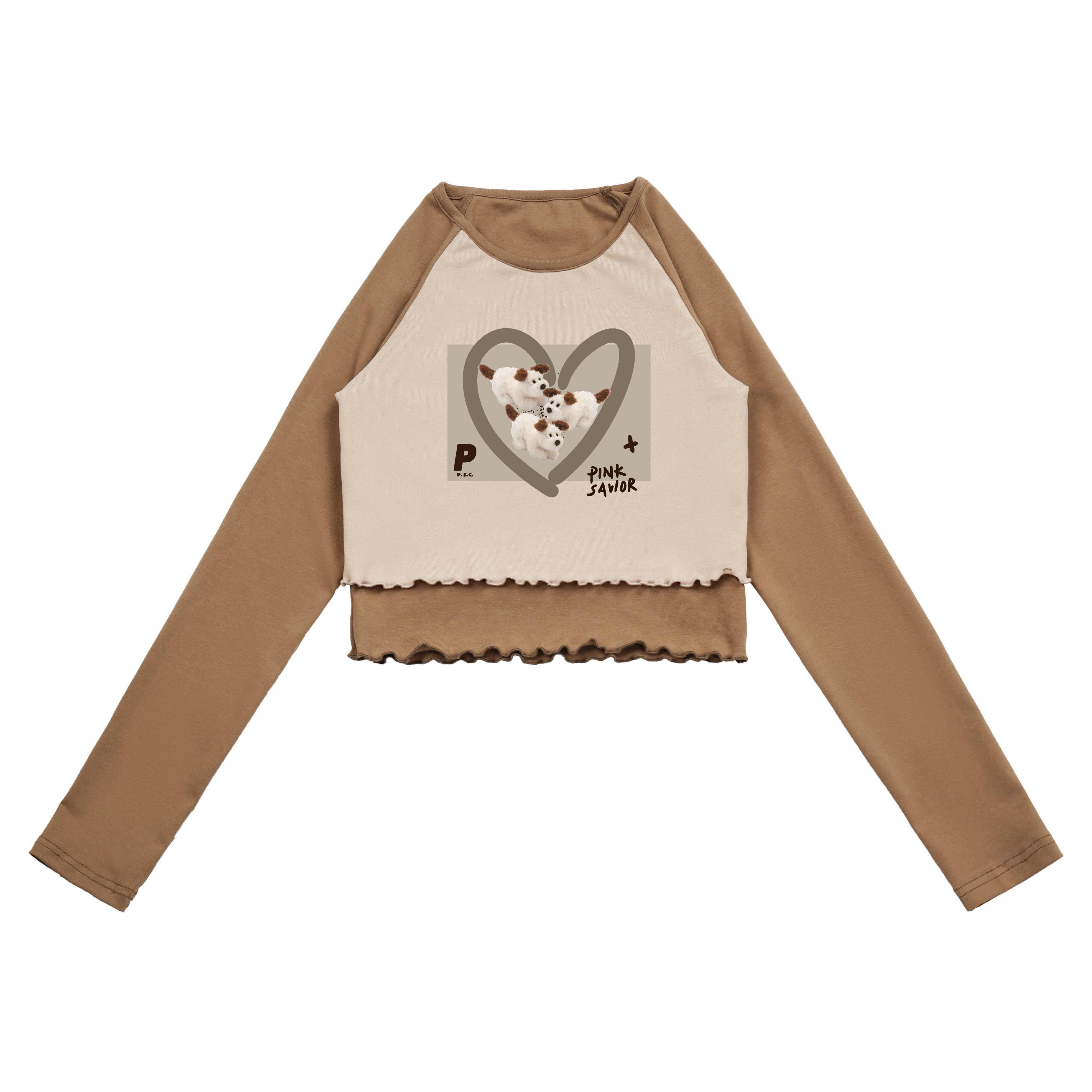 pinksavior 二層裾 カーキ プリント おもちゃ 子犬 秋 英国風 長袖 ロング ピンク オータム 秋物 PSTB84211076831