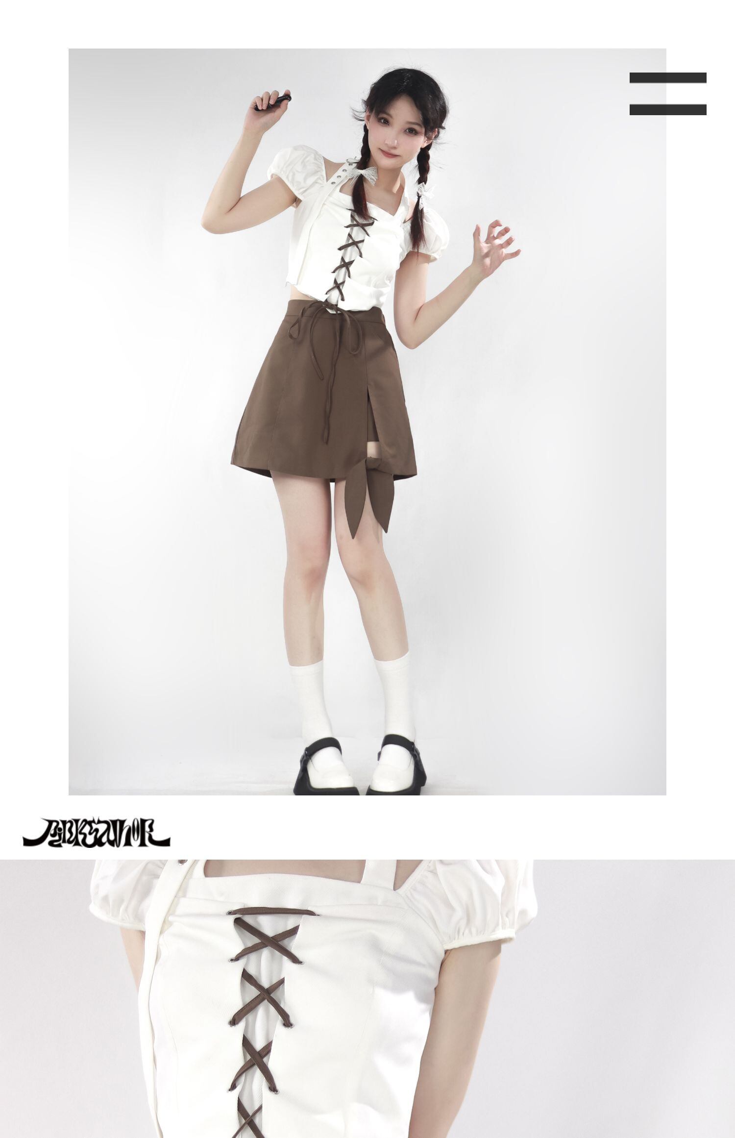 色:白のシャツ,カーキ色のシャツ,ノットヘムスカート,ビッグボウキュロット