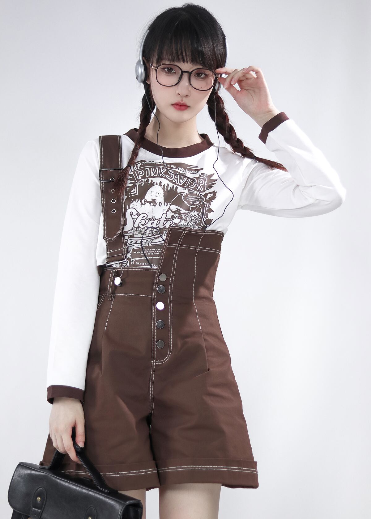 ピンクセーバーデザイン ブラウン サスペンダー ジャンプスーツ アメリカンプリント プリント 初秋 スーツ オータム 秋物 PSTB45000736014