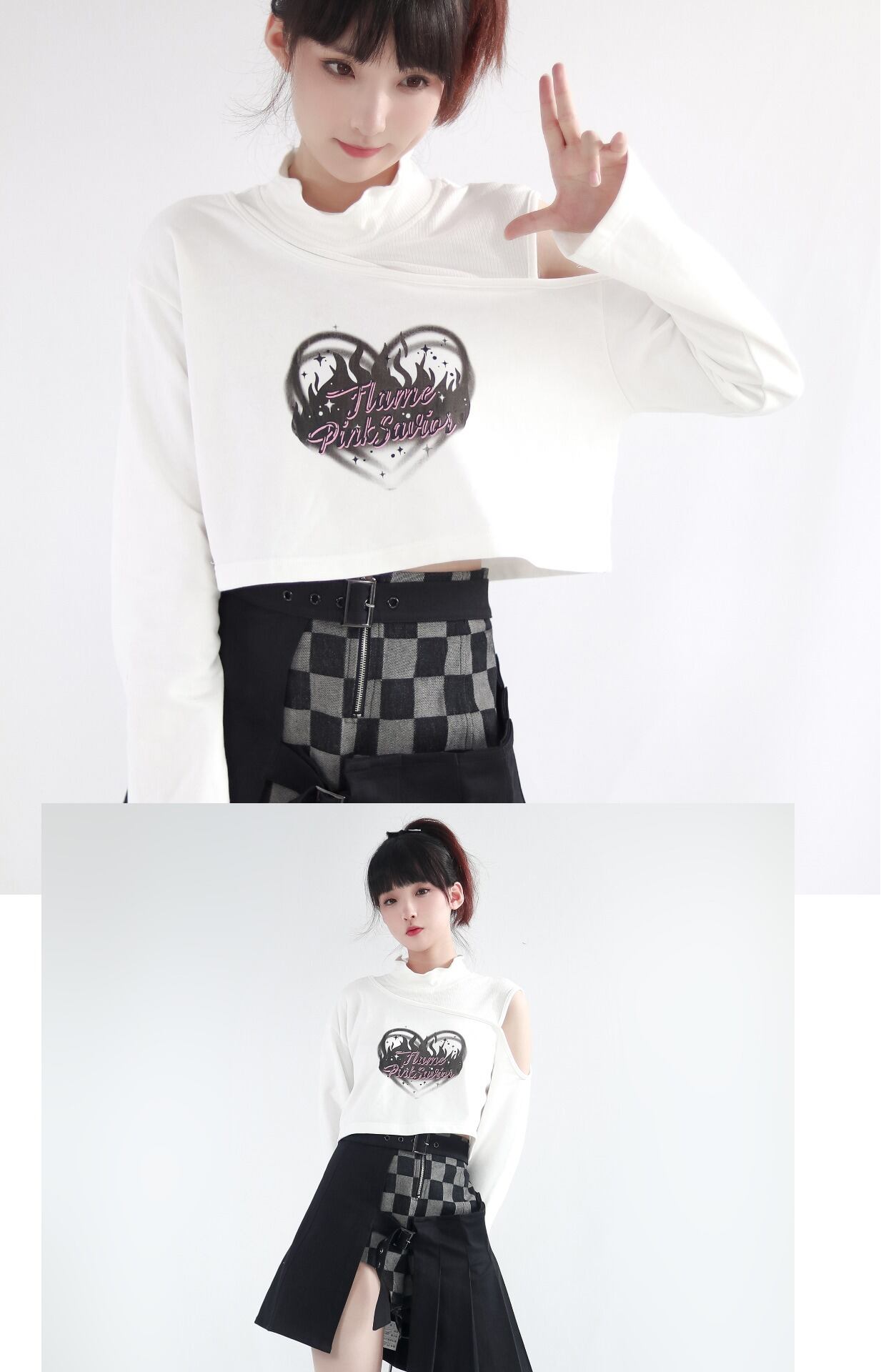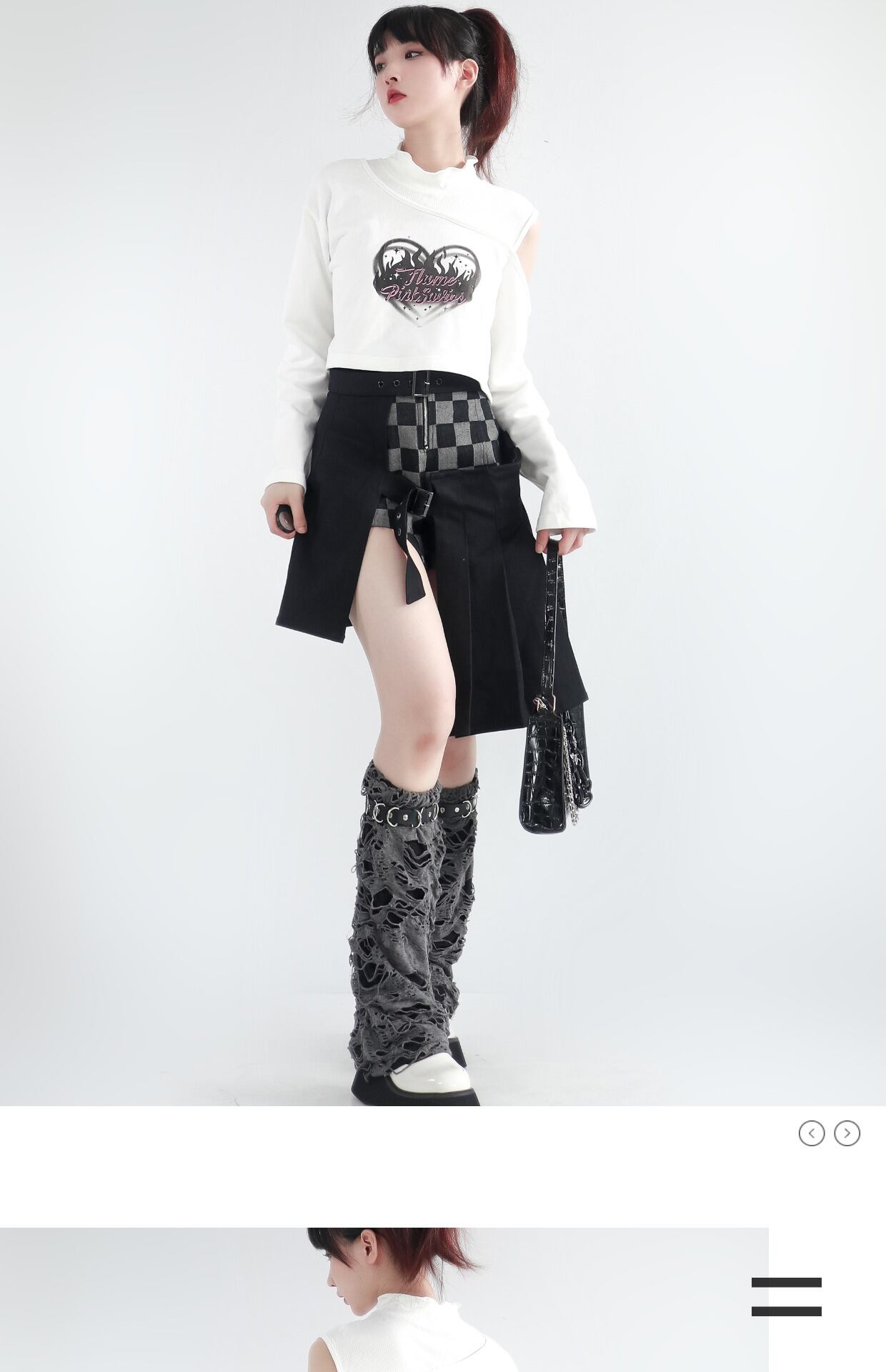 色:ブラックチェッカーボードデニムキュロット,ホワイトショルダー長袖
