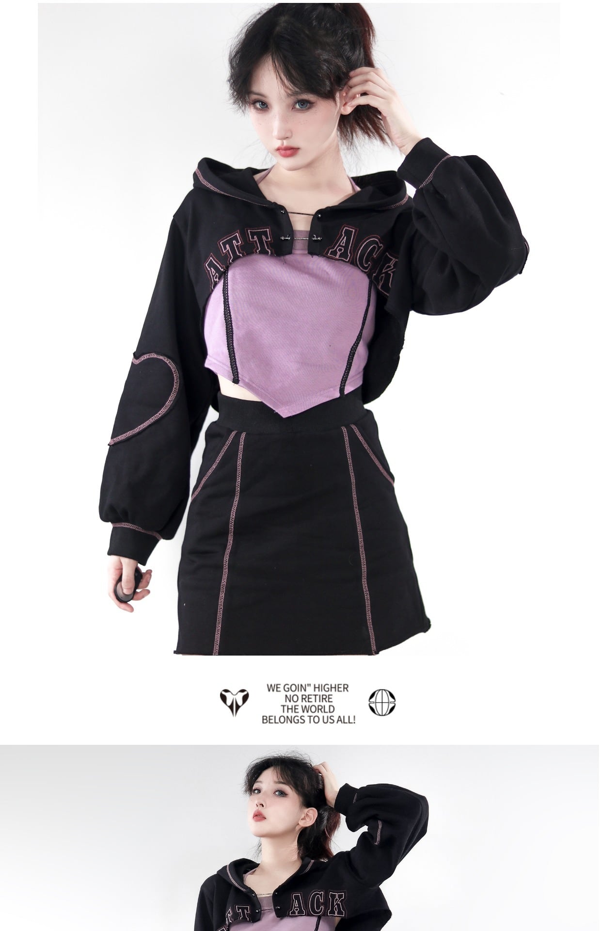 色:フード付きトップ,ホルターネックの紫色のベスト,コントラストトップステッチスカート,トライアングルヘムトップ,コントラストトップステッチパンツ
