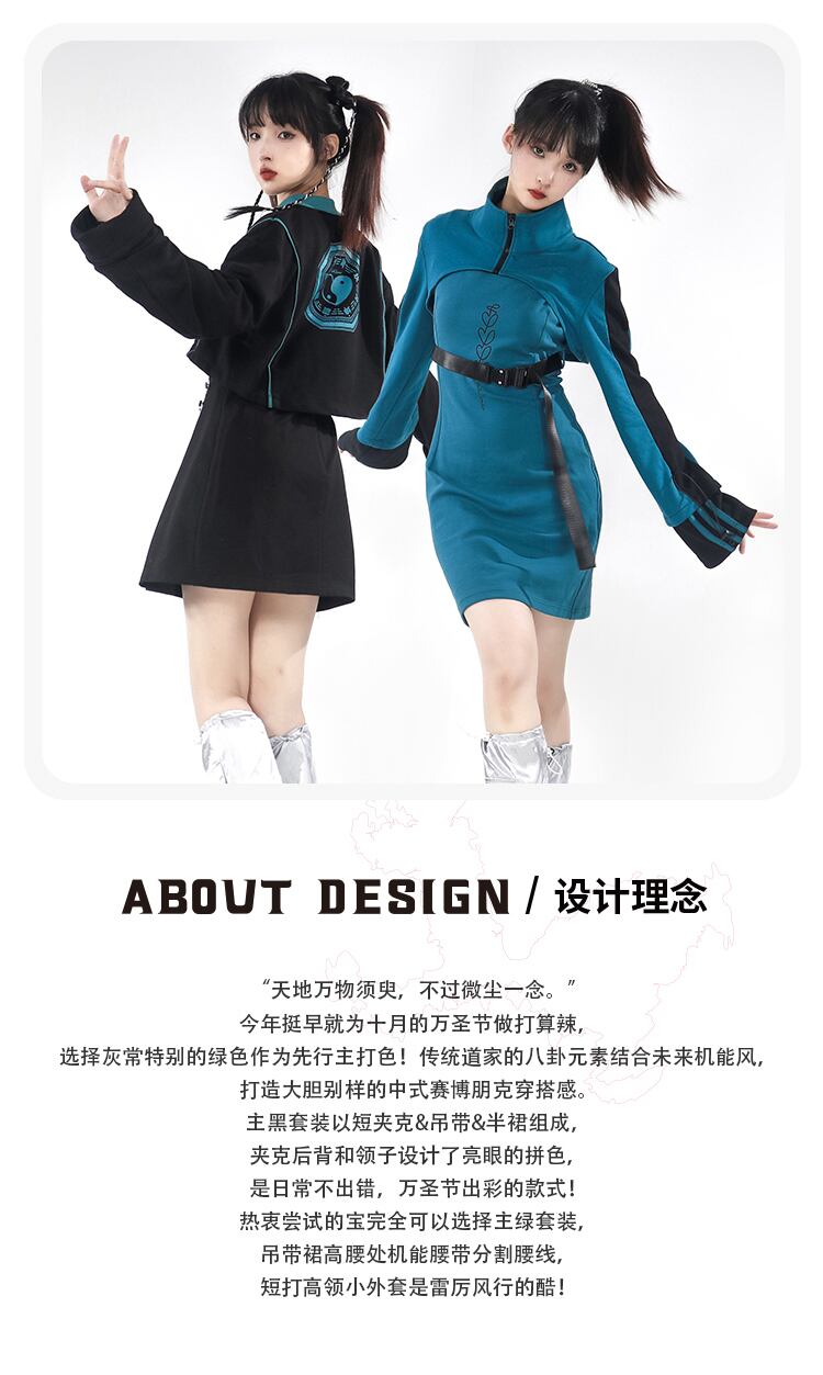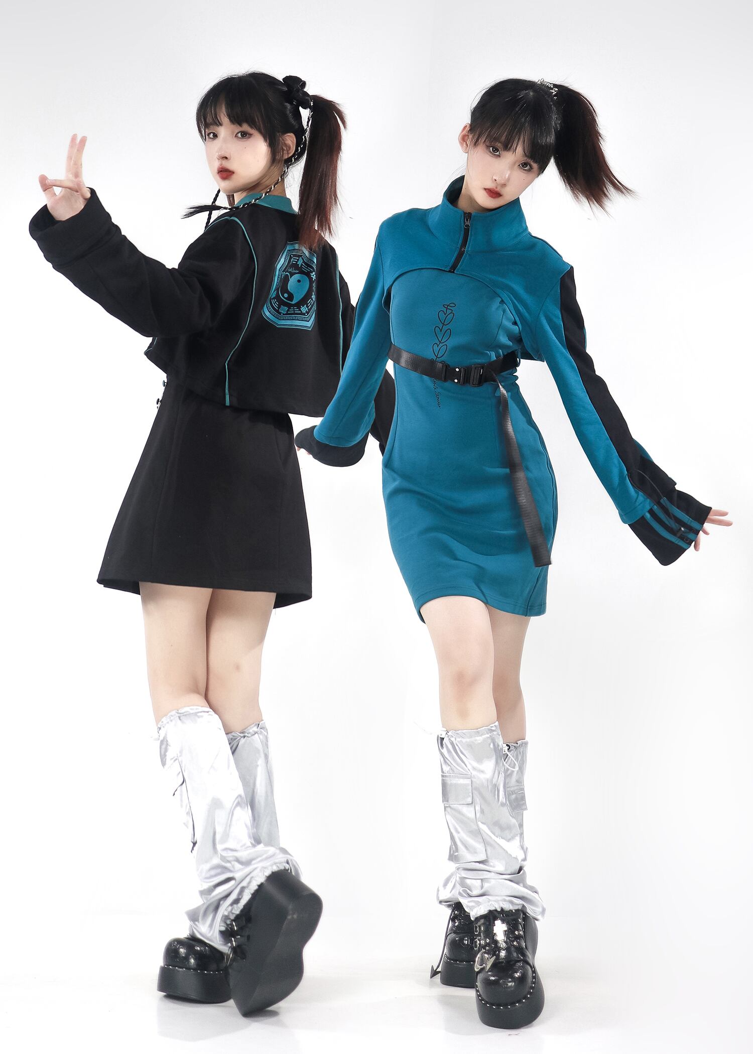 色:ブラックショートコート,スカート,グリーンバント,青緑色のトップ,黒スカート