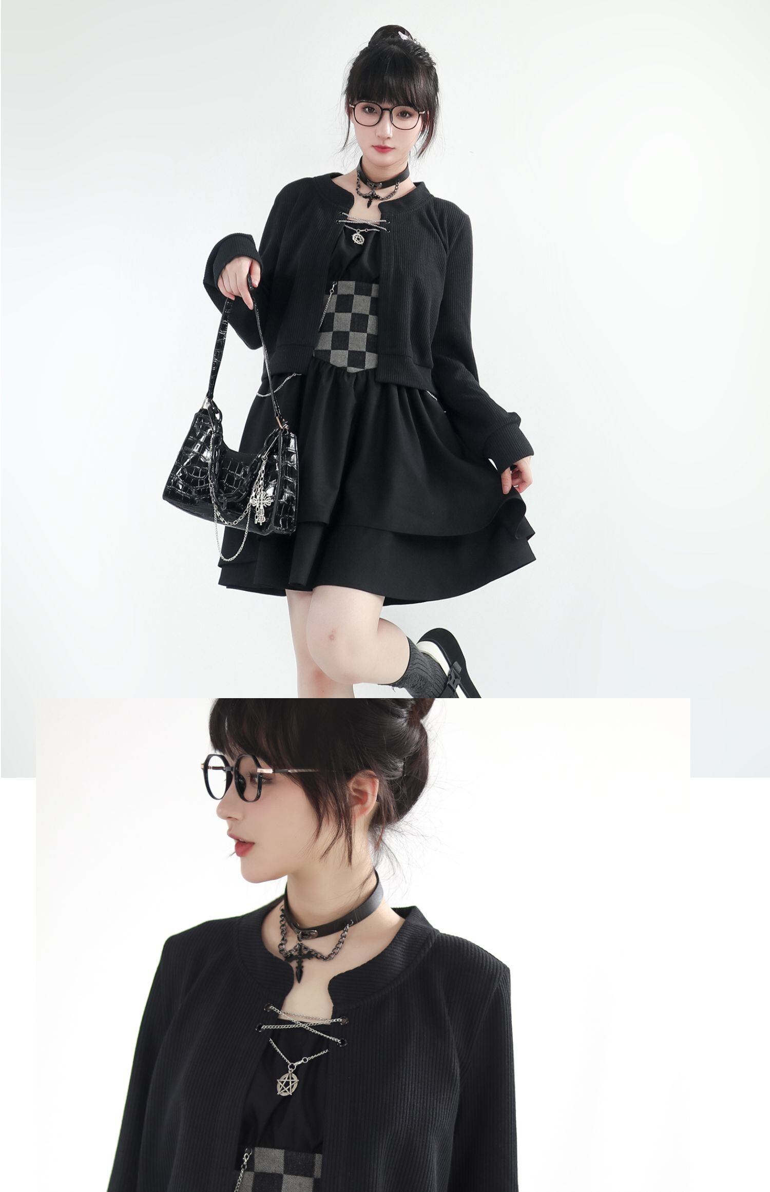 ピンクセーバー マジック デニム チェッカーボード ウエスト サスペンダー スカート 黒と白の小さなカーディガン 秋の友達のスーツ ホワイト ブラック オータム 秋物 PSTB9414359527