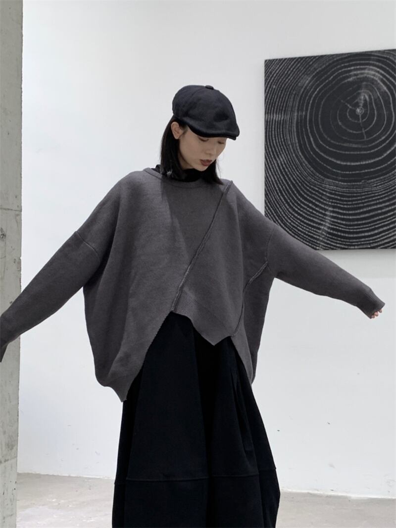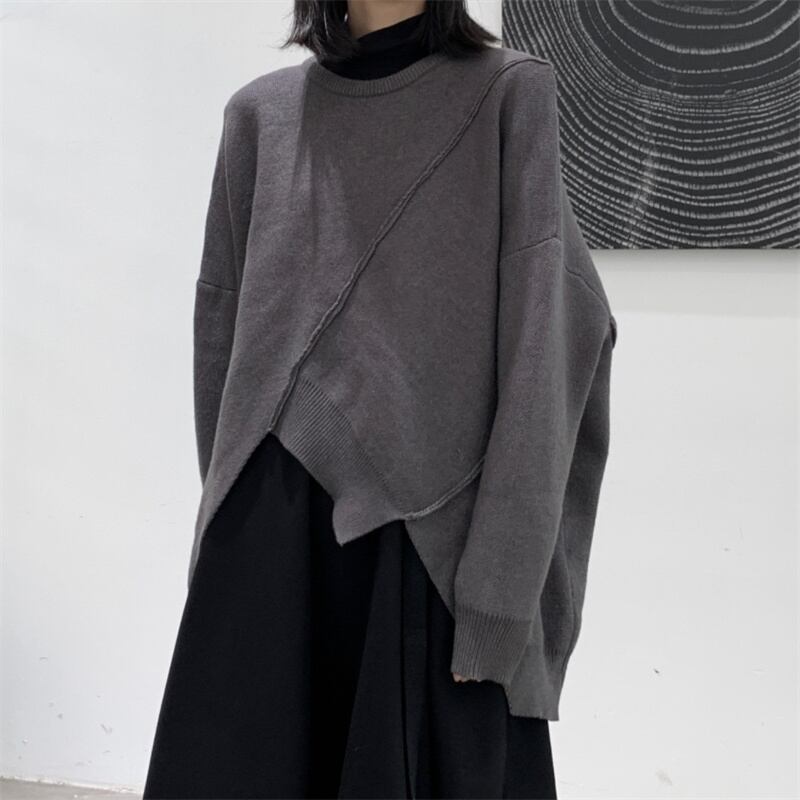ダークレイジーウィンドイレギュラーヘムスプライシングラウンドネックウィンターシックニットセータールーズシンニットセーター 冬物 Oネック BWTB5196861505