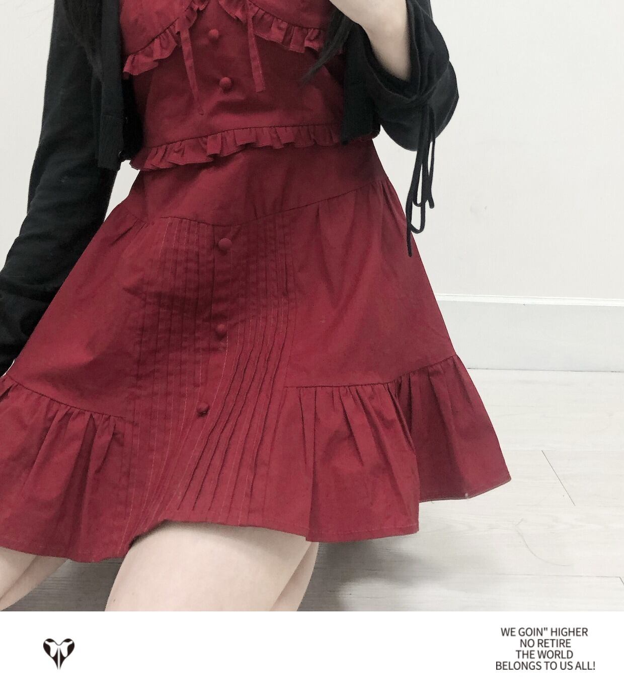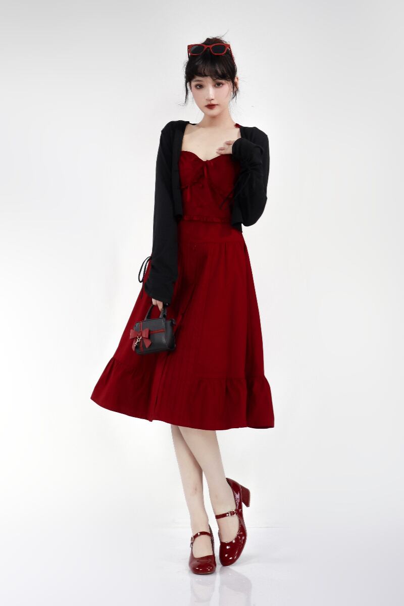 色:レッドショートサスペンダースカート,赤いロングサスペンダードレス,黒のロングスリップドレス,黒のショートスリップドレス,ブラックニットカーディガン,赤いニットカーディガン