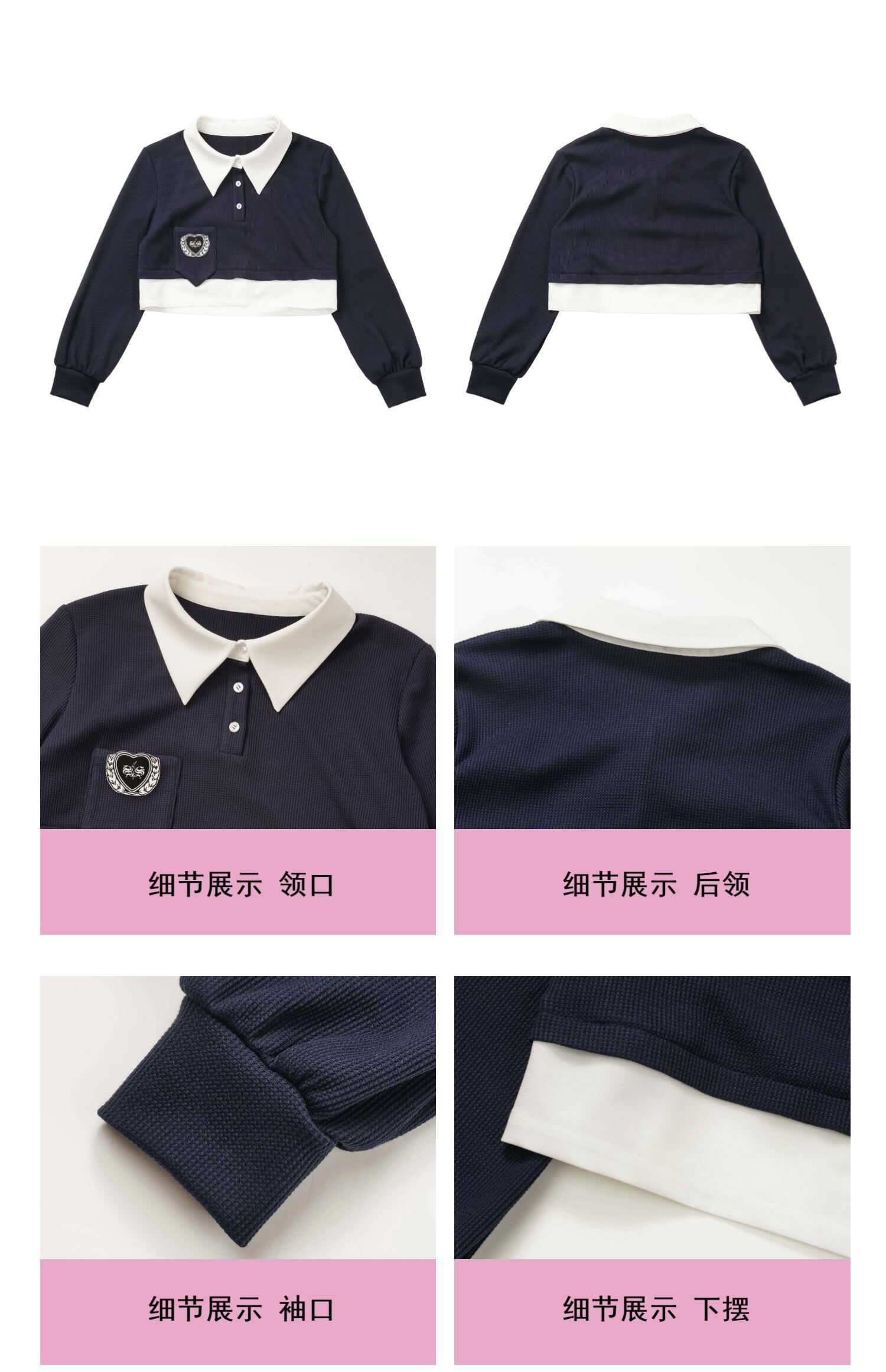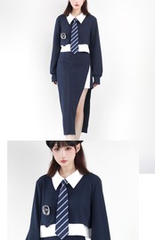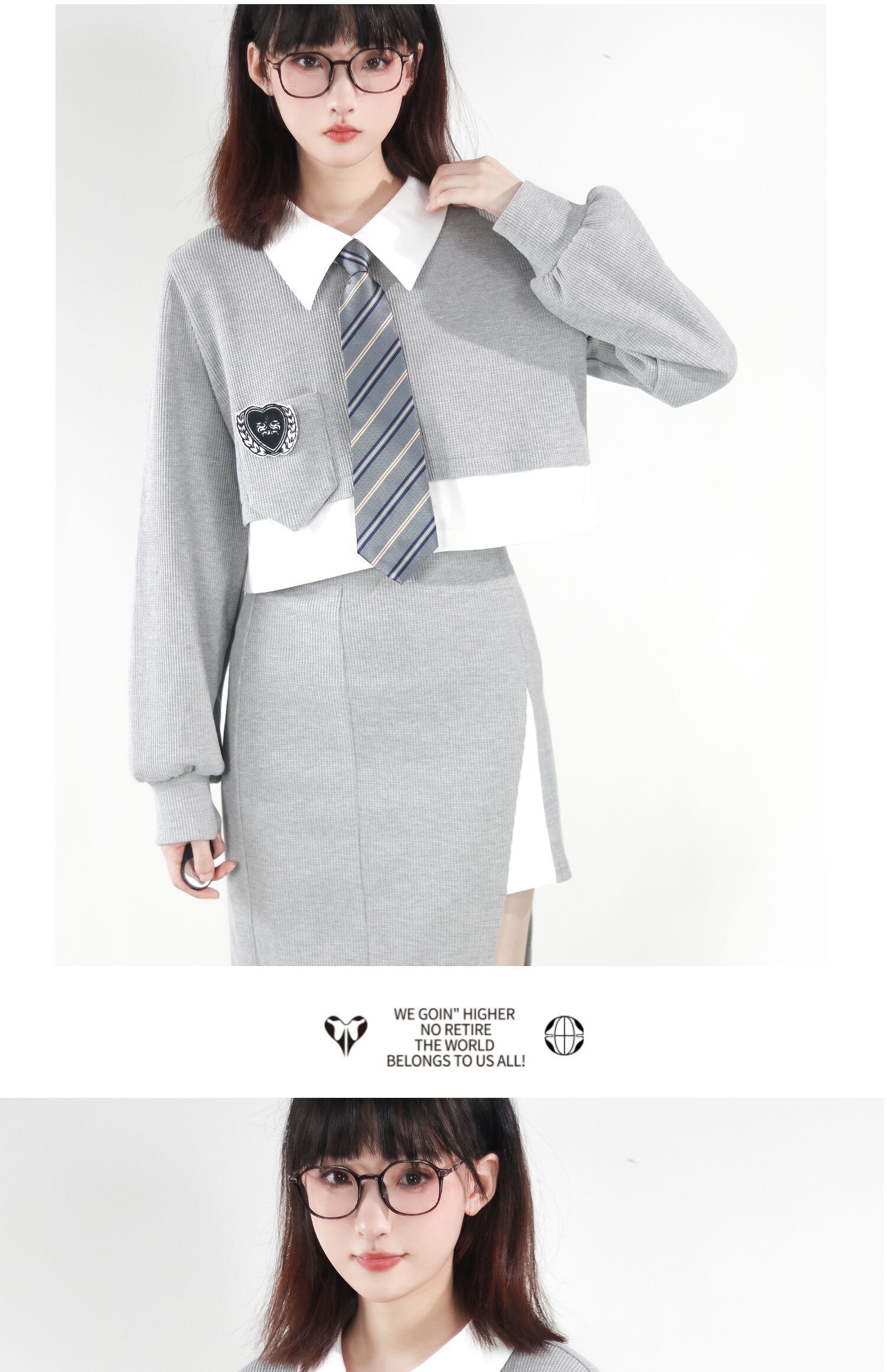 色:グレーフェイクツーピースシャツトップ,グレースカート,ネイビーブルーフェイクツーピースシャツトップ.,ネイビーブルーのスカート