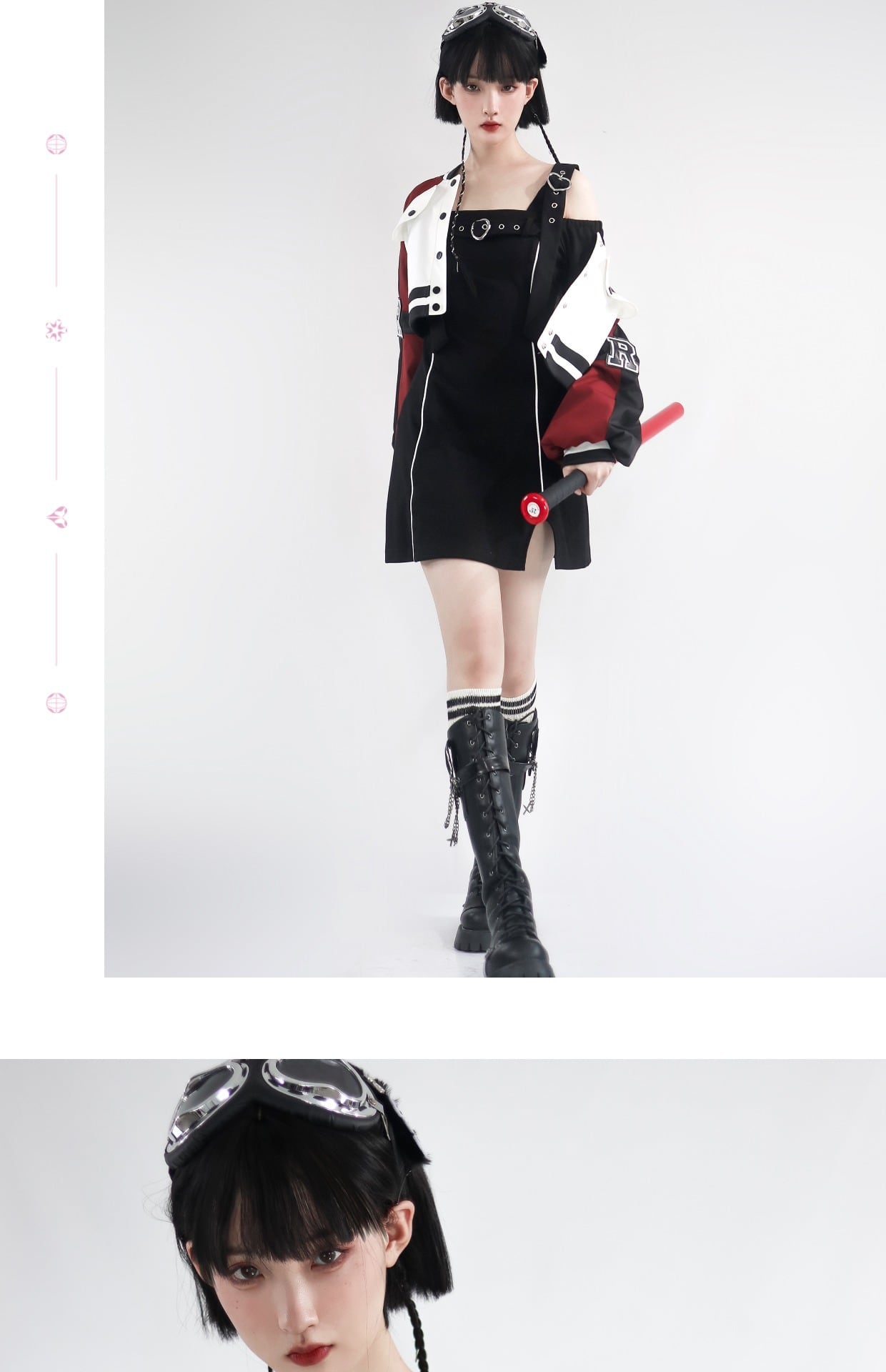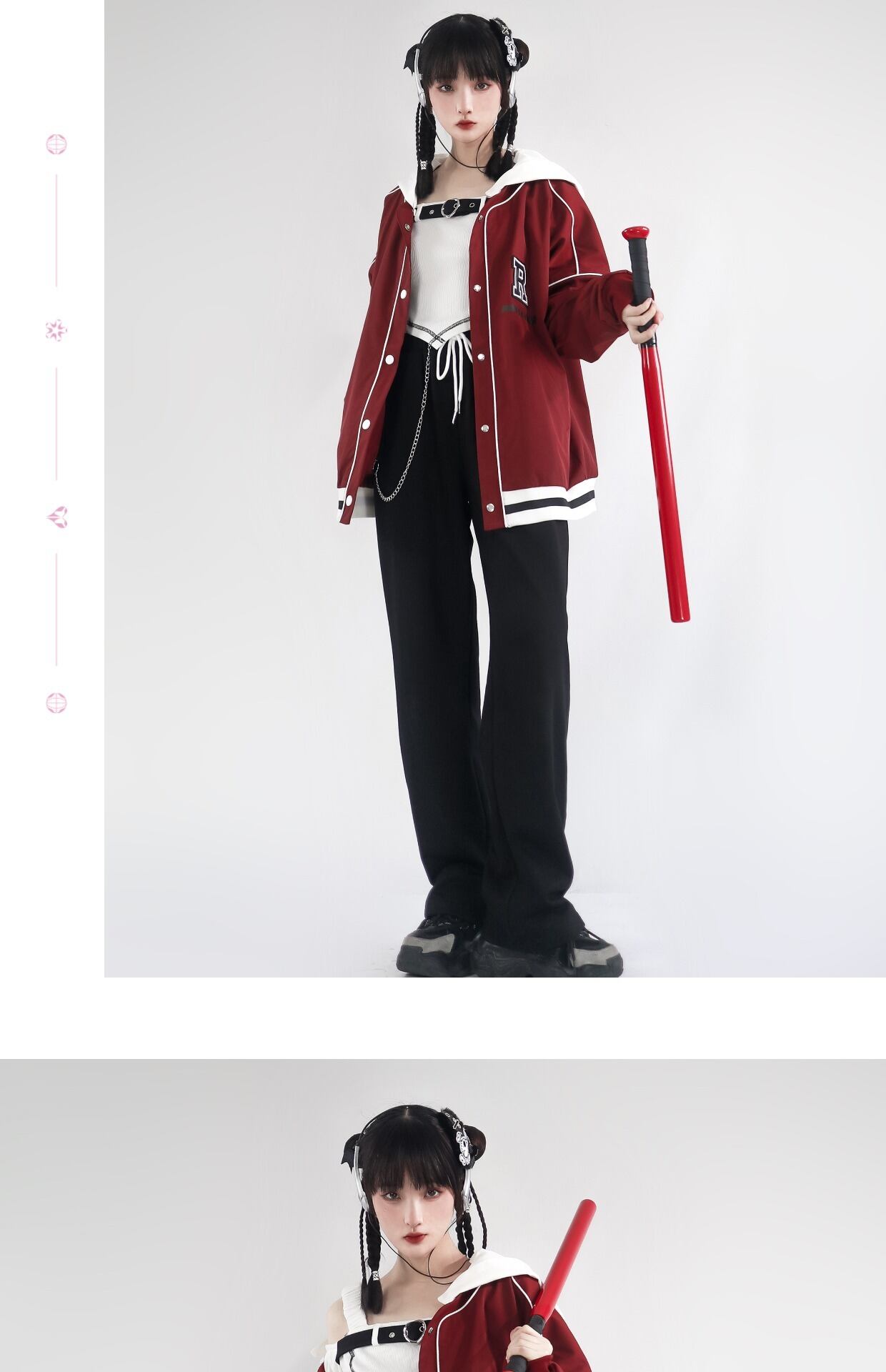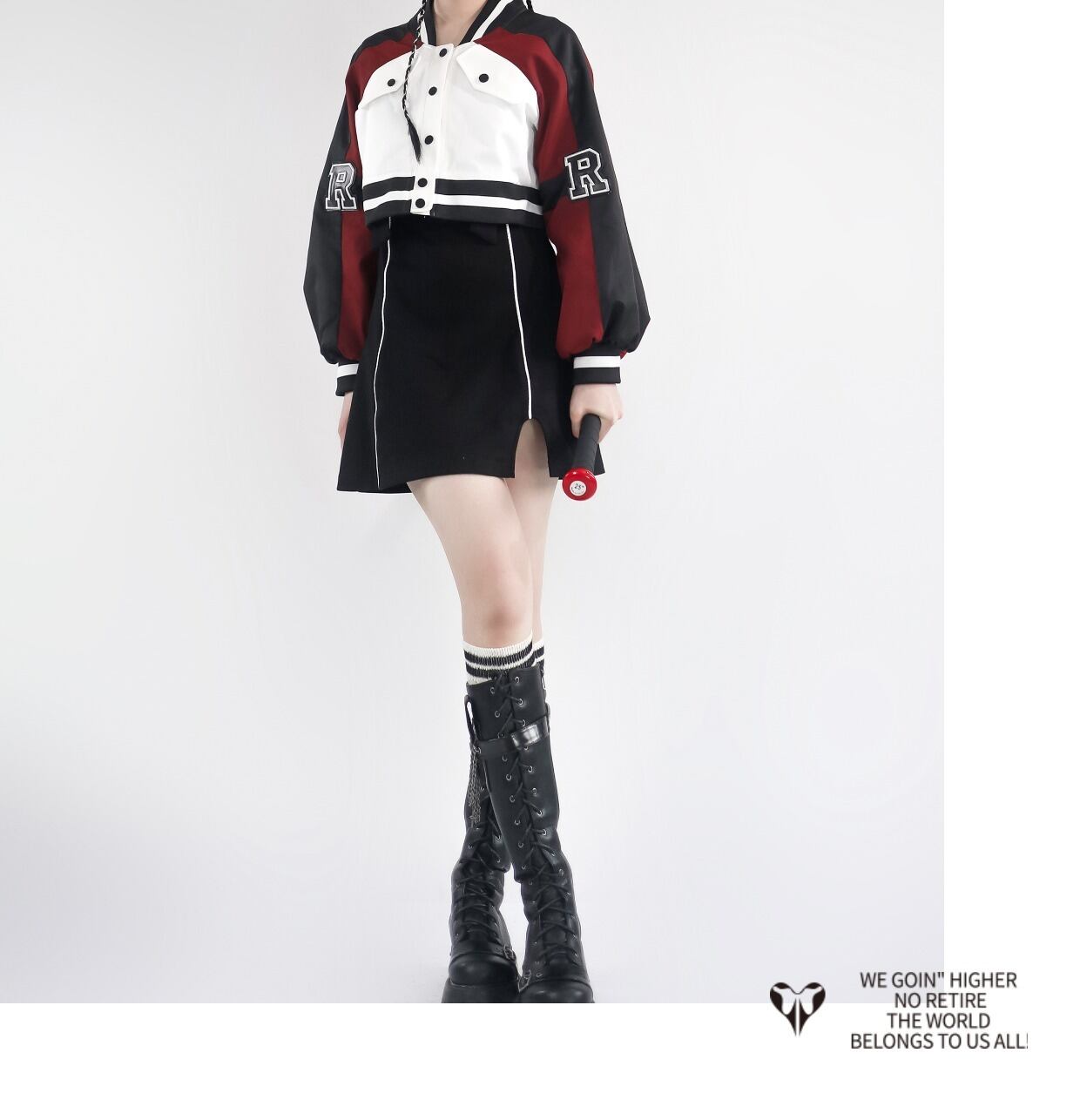 色:短い野球ユニム,ラブドレス,ミッドレングスベースボールジャケット,三角裾ホワイトトップ,黒いズボン