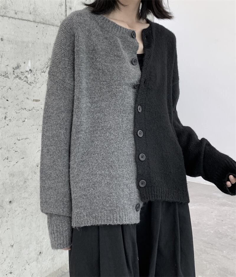 ディアブロヤマモト 怠惰なスタイル 秋冬 あったかセーター レディース アシンメトリー 黒×グレー ステッチデザイン ラウンドネック カーディガン コート ブラック オータム 秋物 ウィンター 冬物 Oネック BWTB18311885393