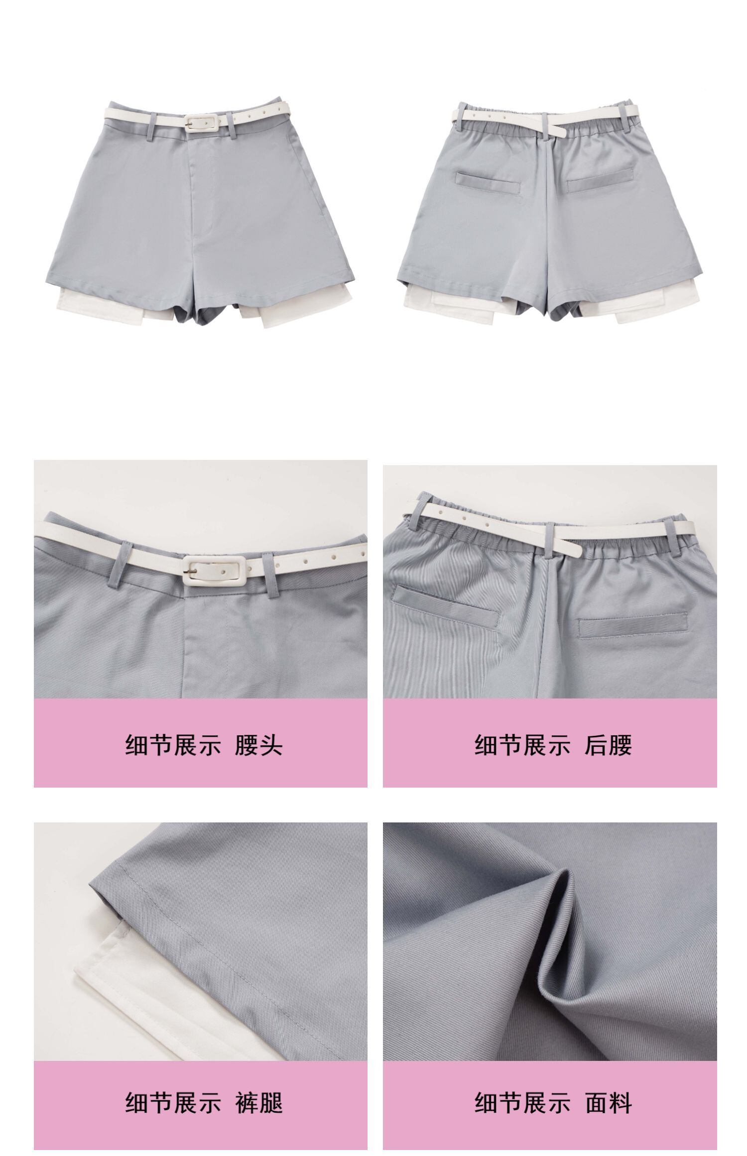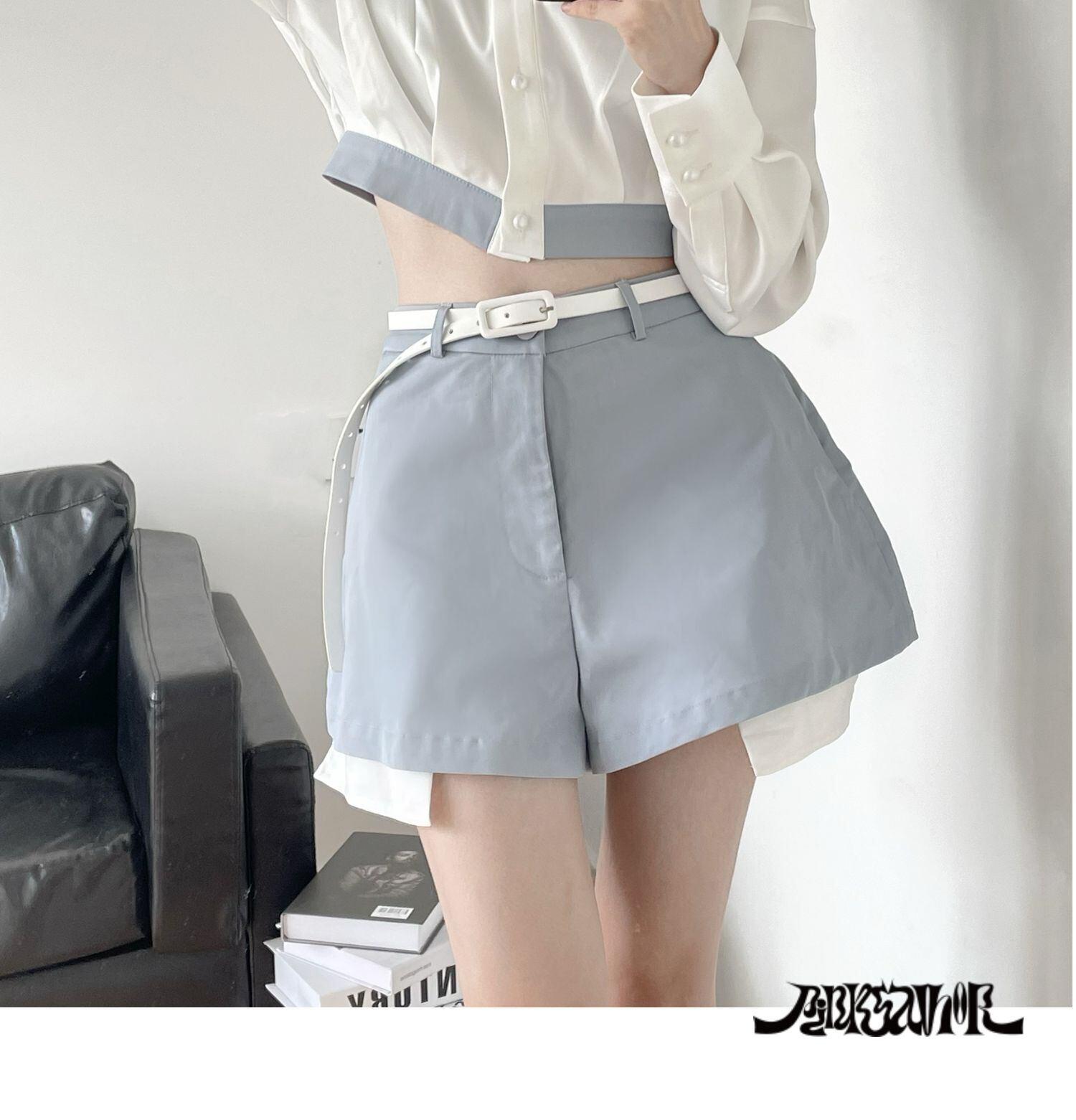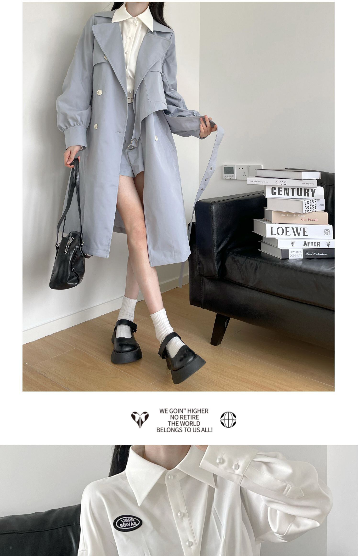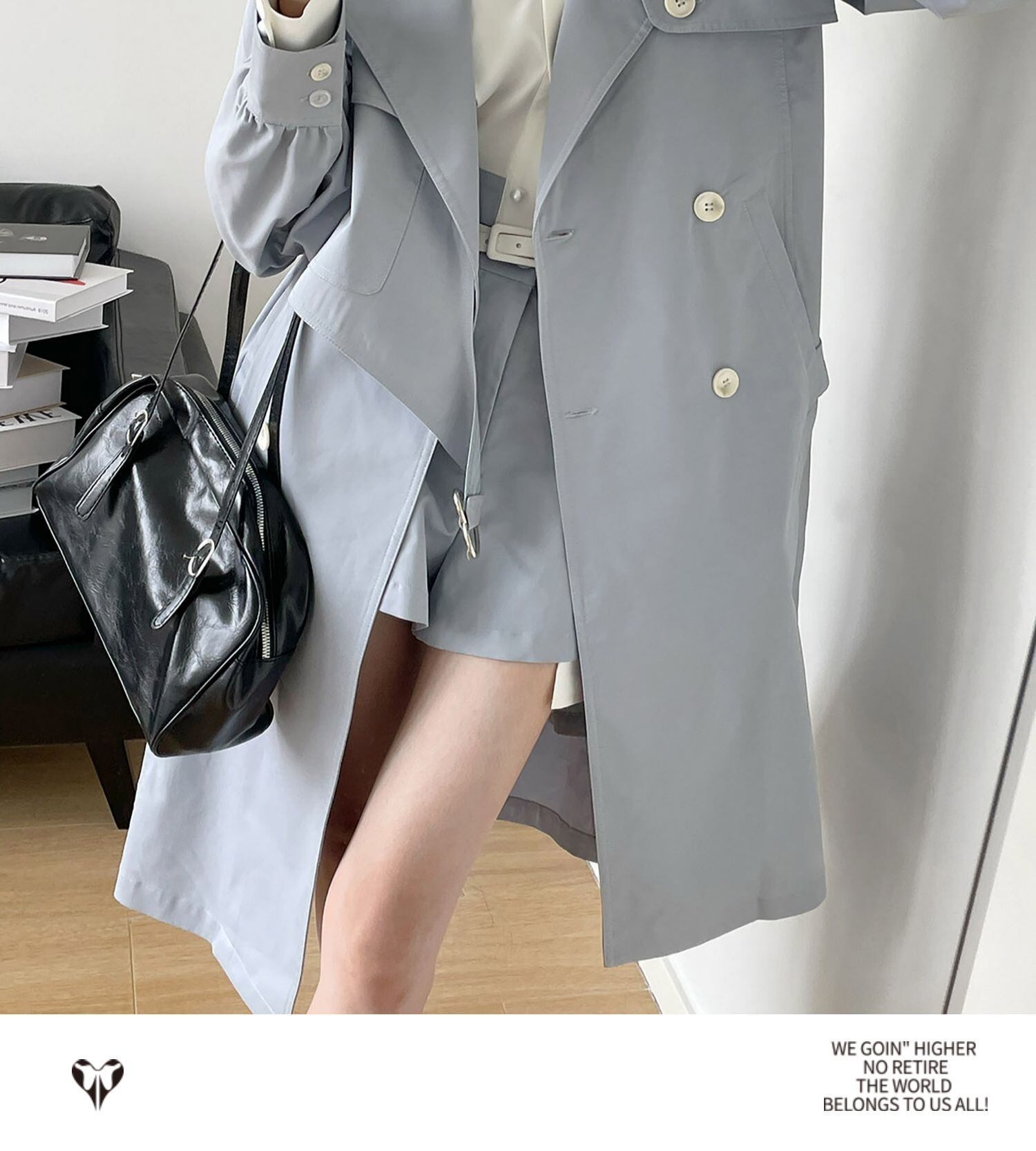色:ブルートレンチコート,白のシャツ,ホワイトショーツ