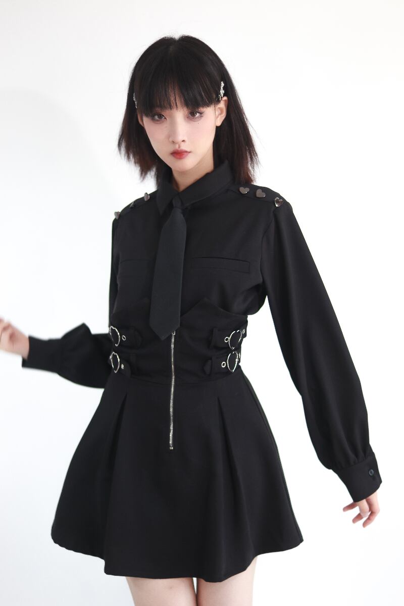 色:ブラックシルクスクープネックデコラティブドレス,黒いシャツ,黒スカート