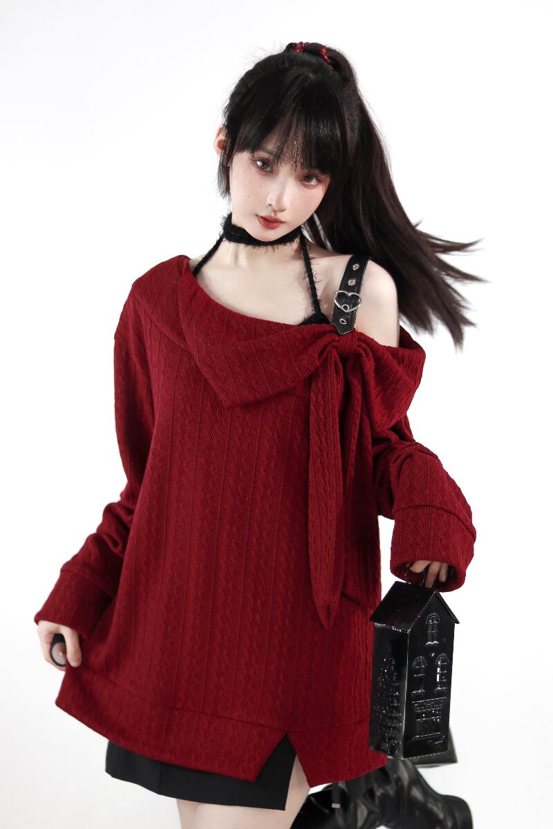 色:レッドニットセーターフリーチェストスリング,チェストストラップ付きブラックニットセーター