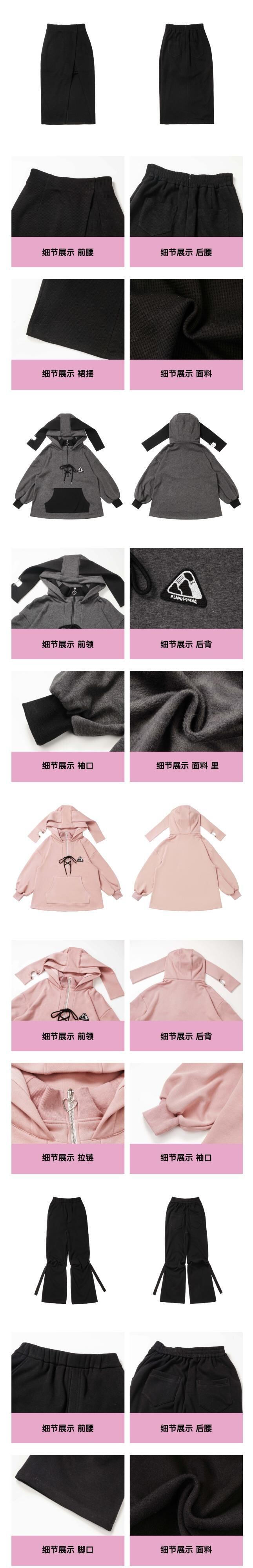 色:フード付きショートセーターピンク,フード付きショートスウェットシャツグレーブラック,マスク+ボトムシャツ,ハイスリットロングスカート,パーカーピンク,フーデッドロングスウェットシャツグレーブラック,ズボン
