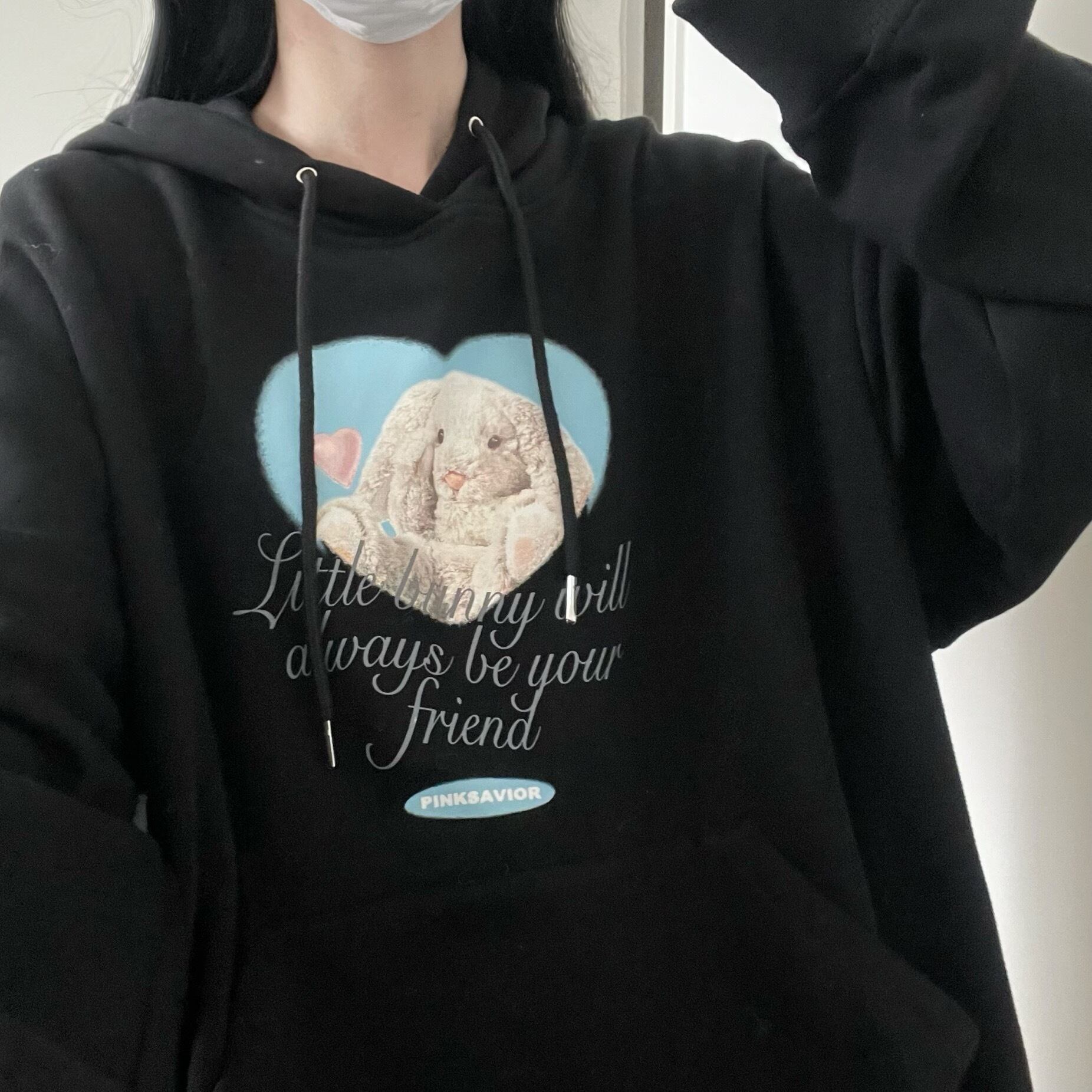 ピンクセーバープラスベルベット秋と冬のピンクと黒のウサギのフード付きプリントレトロアメリカンセーター女性 ブラック オータム 秋物 ウィンター 冬物 PSTB74375124135